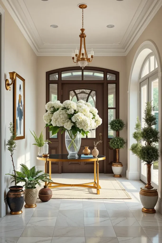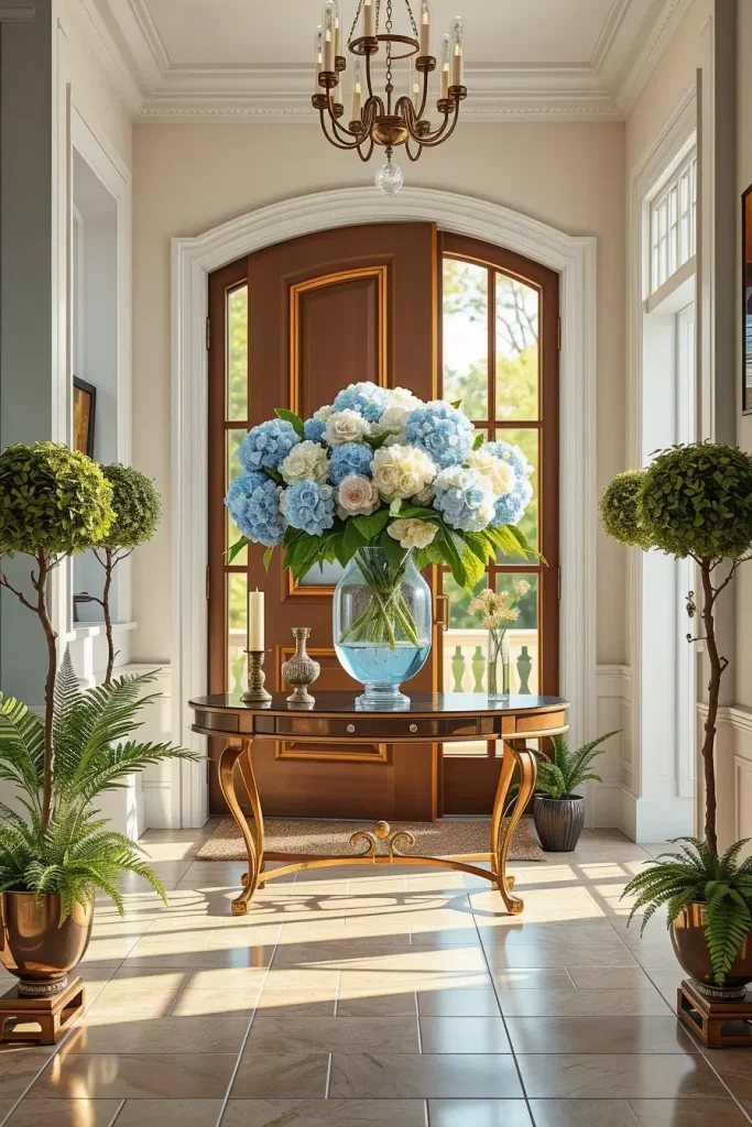I tend to dress an entry console with a large vase of hydrangees, roses, or tulips based on the time of year. The door can also be framed with ferns or potted topiaries to continue the greenery past the entry table.