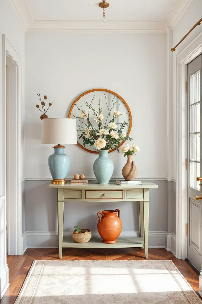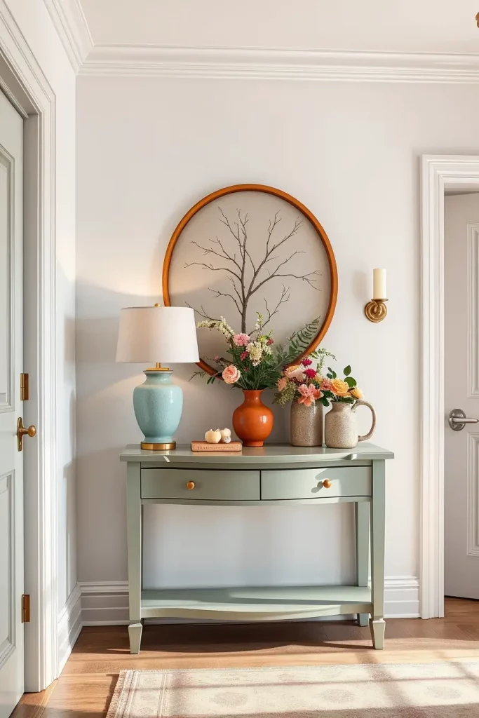 To narrow this concept, I would recommend that you look at wall art or framed prints that match your accent color. This will render the palette deliberate as opposed to unintentional, and it will contribute to the overall beauty of the entryway.