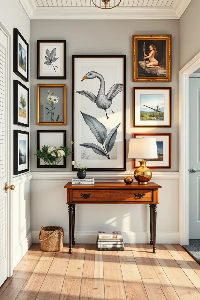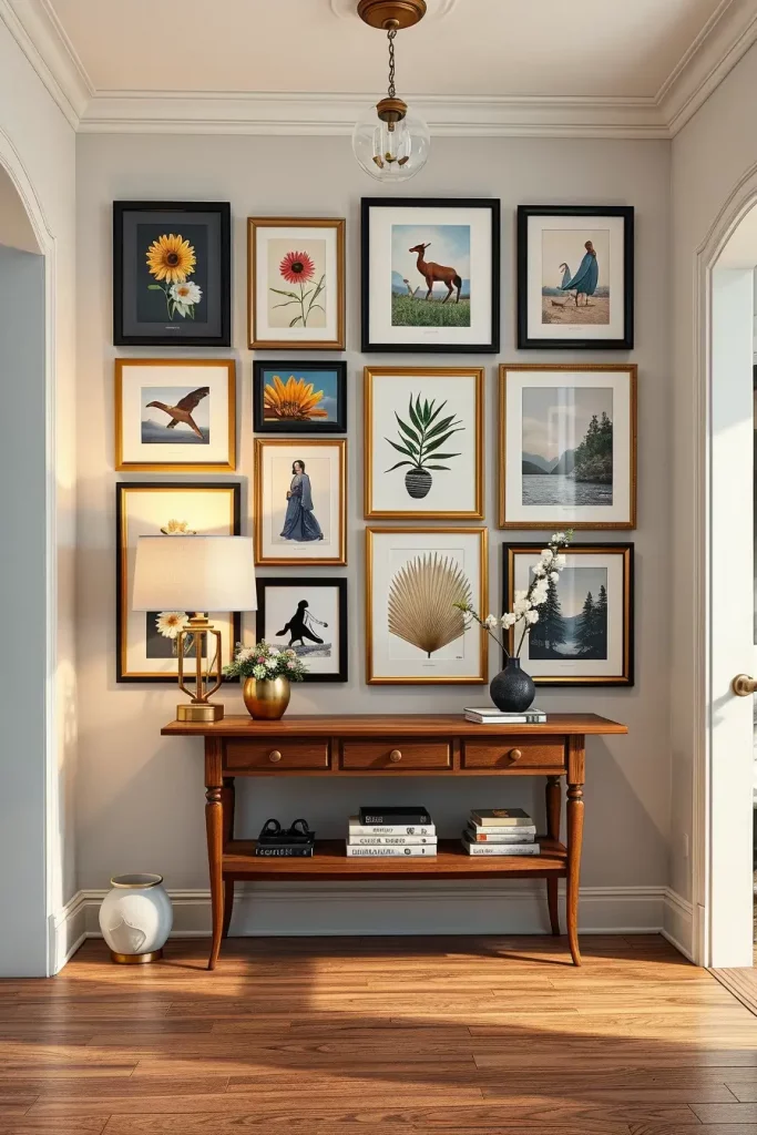 Regarding the particular design, I prefer to make a small gallery wall in the entryway with frames of different sizes but united by color or material. Frames made of black, gold, or wood provide unity without taking away the shine of the art itself. It is also a good idea to place one larger statement piece above a console table to anchor the space.