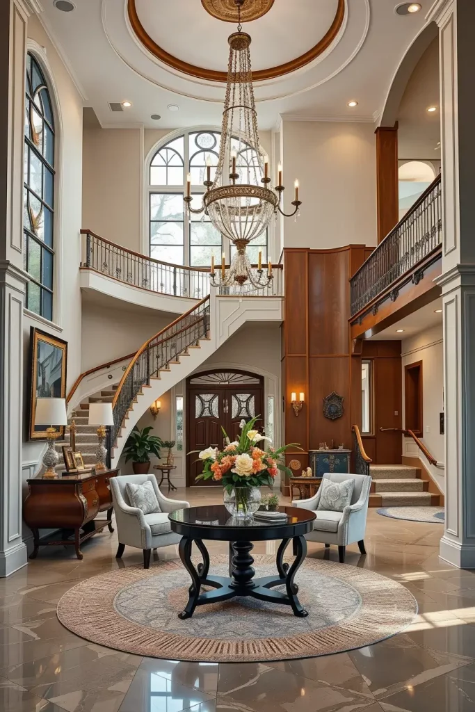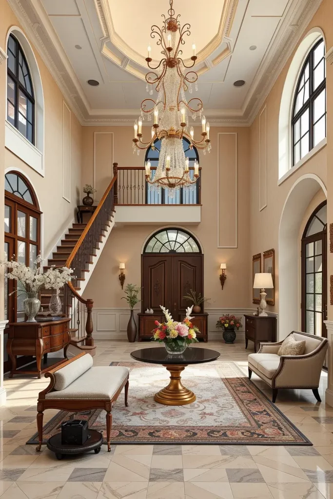 In these spacious places, I suggest large furniture like a large wooden console with carved decorations, and upholstered benches which are functional and comfortable at the same time. Large-scale mirrors or floor-to-ceiling art are dramatic yet still elegant. Tiered chandeliers are statement lighting that makes the space feel cohesive and scaled appropriately.