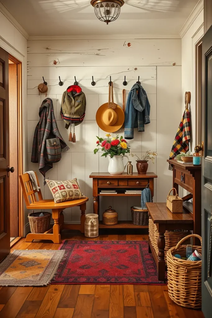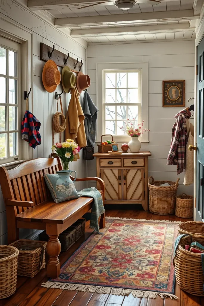 The essentials include a solid wooden bench, coat and hat hooks and a wide console table. The theme of the country is supported by the introduction of old-fashioned accents, such as enamel pitchers, baskets, or rustic lanterns. I also like the quilt or plaid fabric usage as a warm up touch.