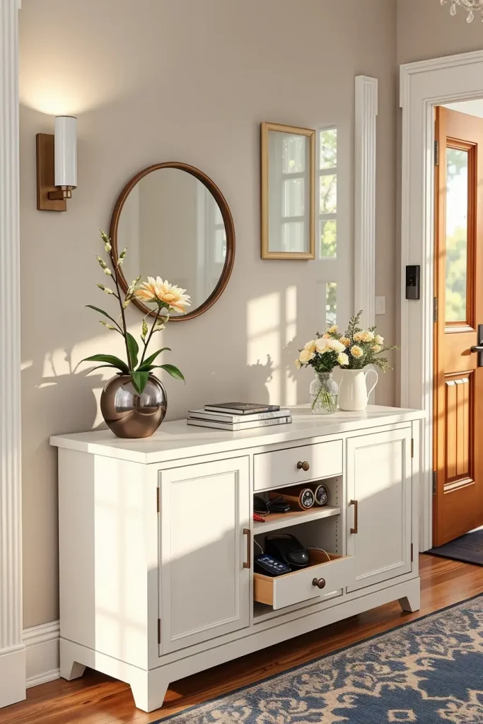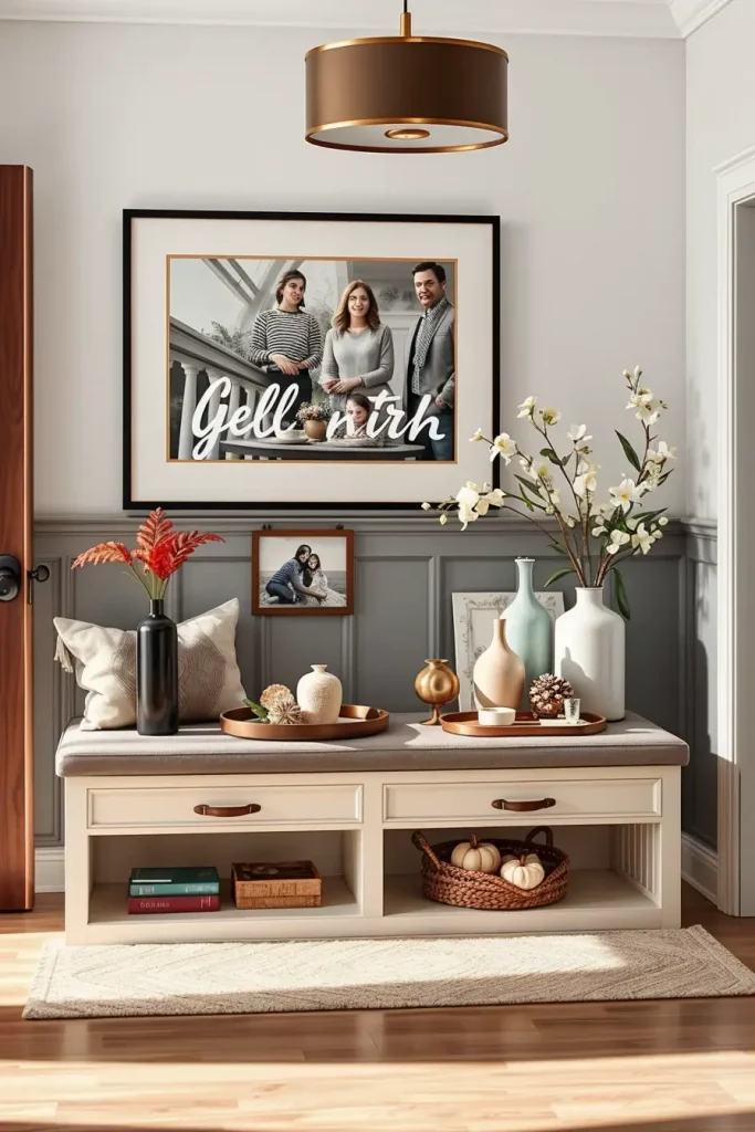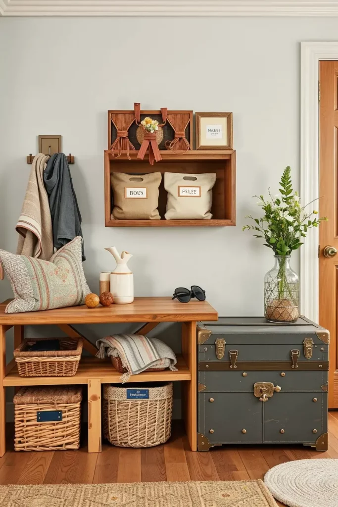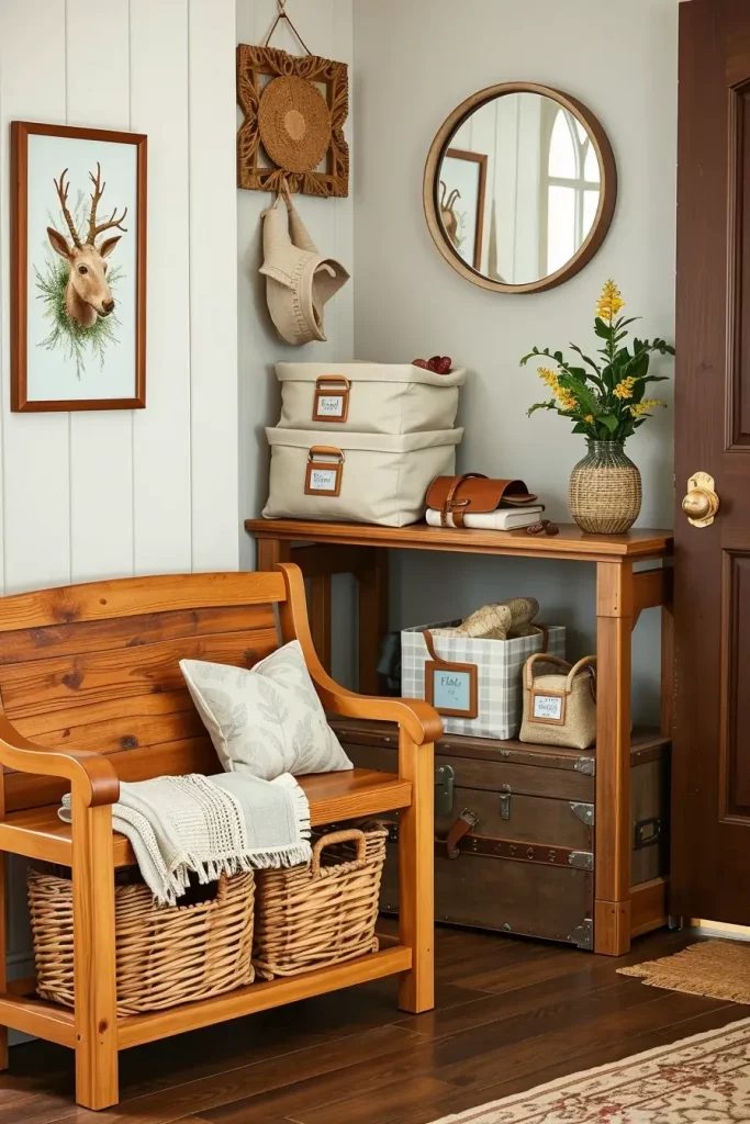To arrange, I would recommend woven bins beneath benches, fabric bins in consoles or decorative trunks that can be used as a storage and sitting area. These components are effective with shoes, scarfs and seasonal accessories. It is important to match the materials used such as wicker, canvas, or wood to the theme of the entry so that it does not seem like clutter.