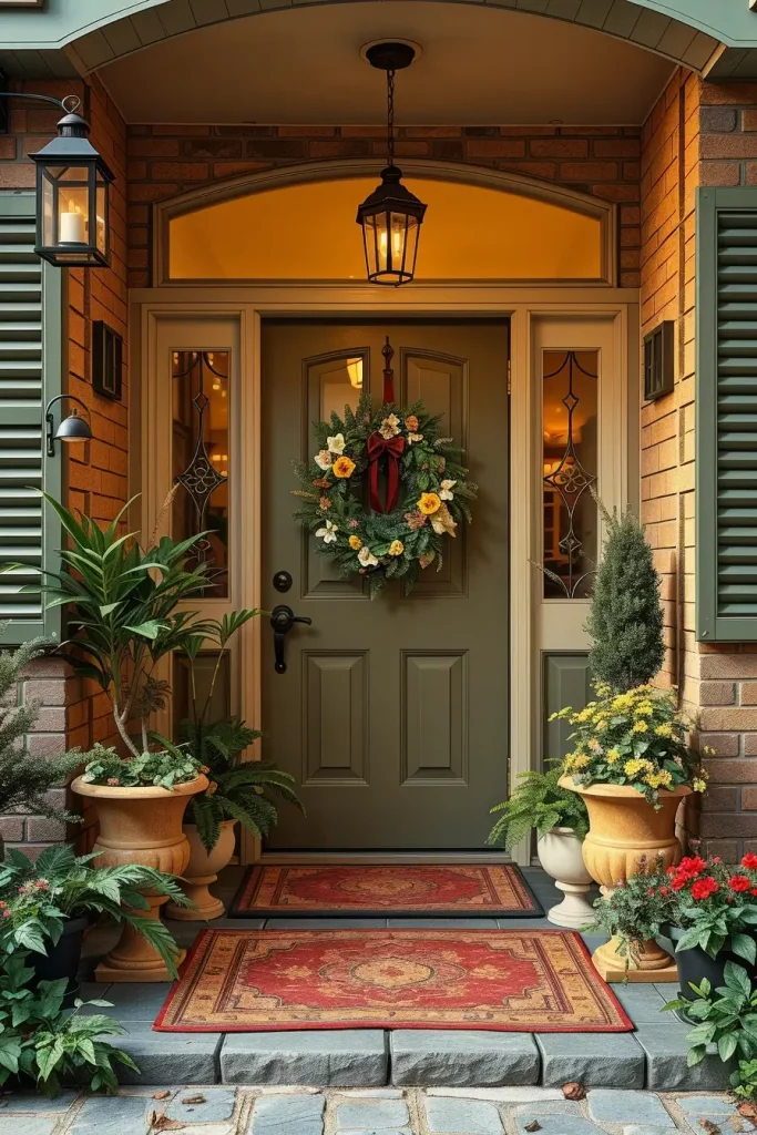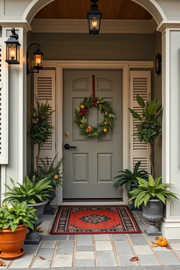 Among the key things I would recommend are potted greenery, seasonal wreaths, lantern-style lights, and a quality outdoor rug. Continuity between the outdoors and the indoors can be achieved by matching the outdoor finishes, including painted shutters or door hardware, with the interior accents. I prefer symmetrical patterns of the planters to outline the doorway, which gives the planter structure and beauty.