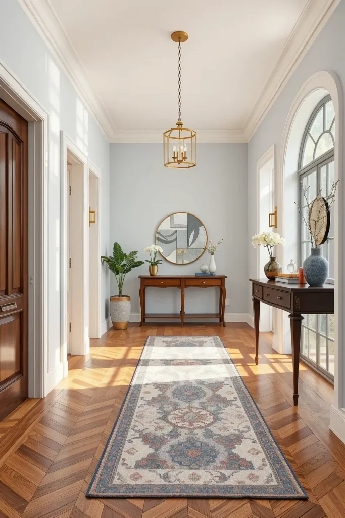 I would go with a combination of neutral walls and contrasting flooring and soft furniture finishes. The look is timeless and versatile with a cream console table, pale gray runner, and low profile accessories.