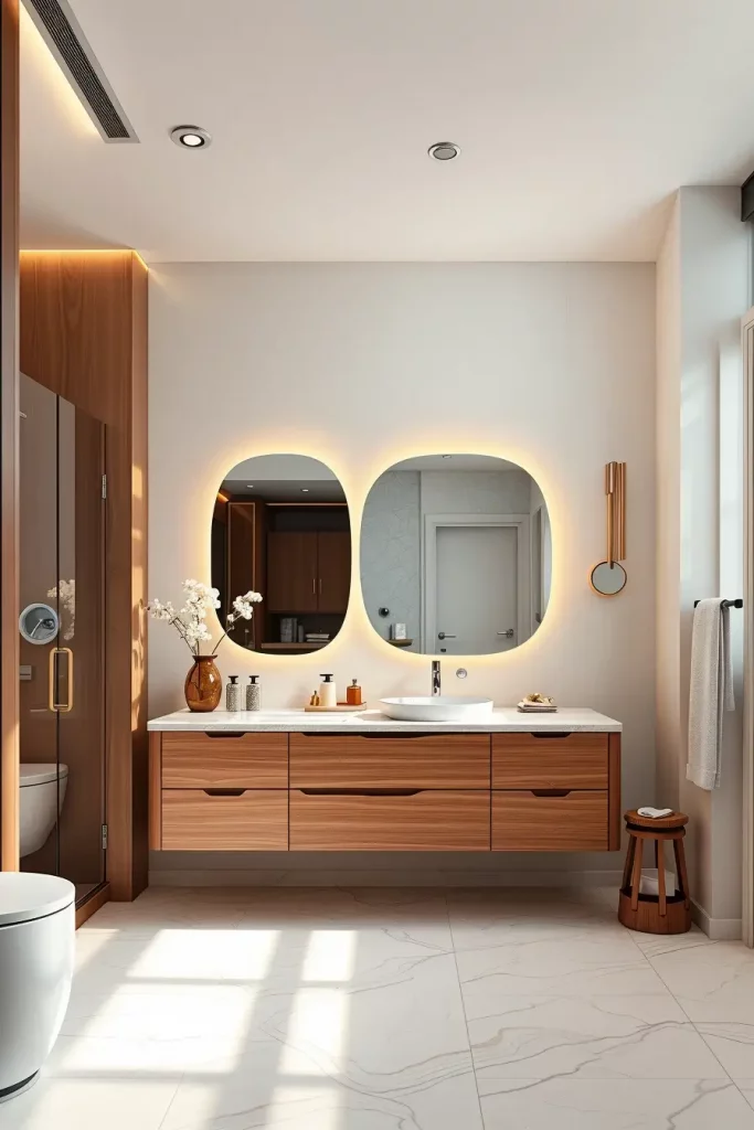 I would like mirrors that have slim frames or inbuilt backlights to have a sleek modern appearance. They could be placed on a top of rounded vanities or on curved walls, and they add volume as well as better task lighting, without causing visual distractions.