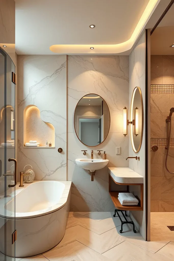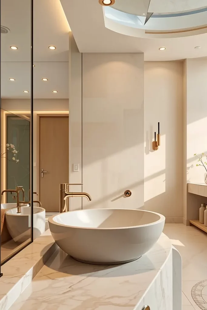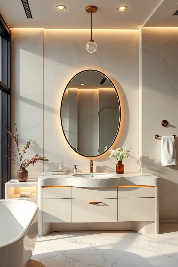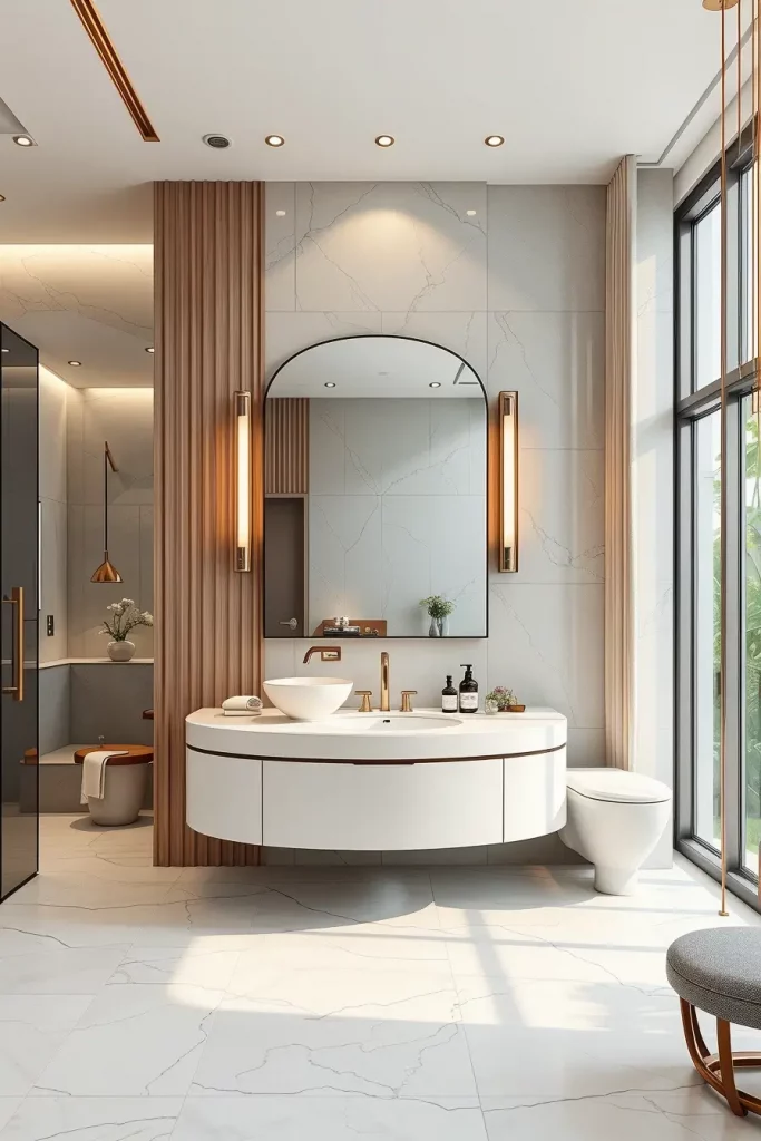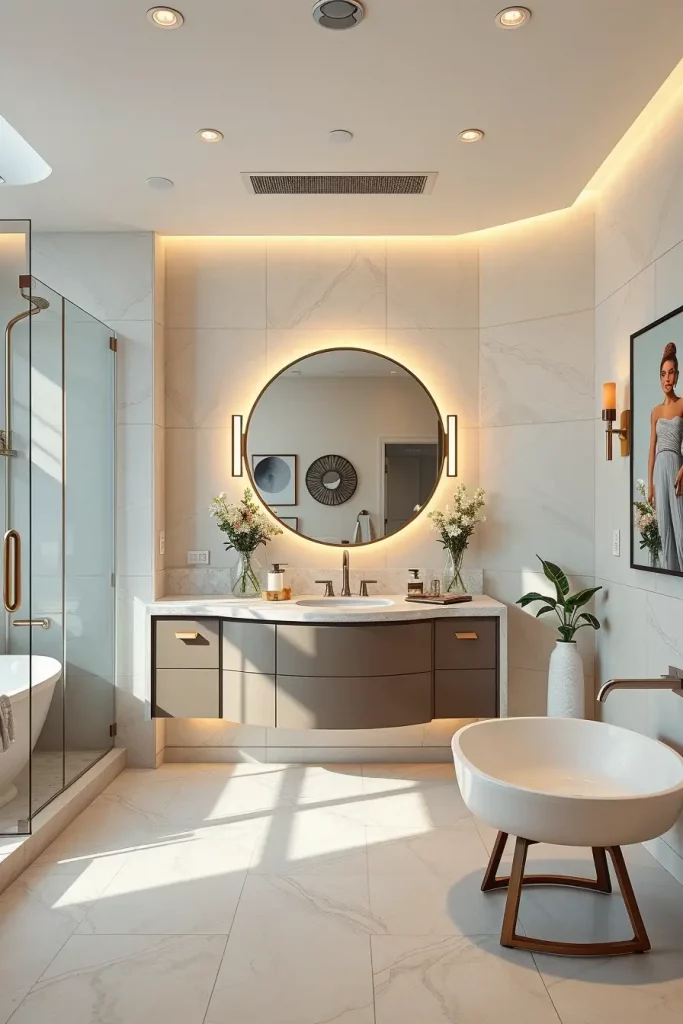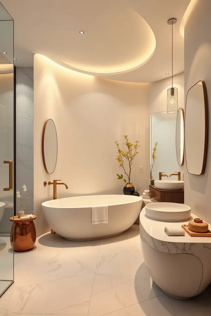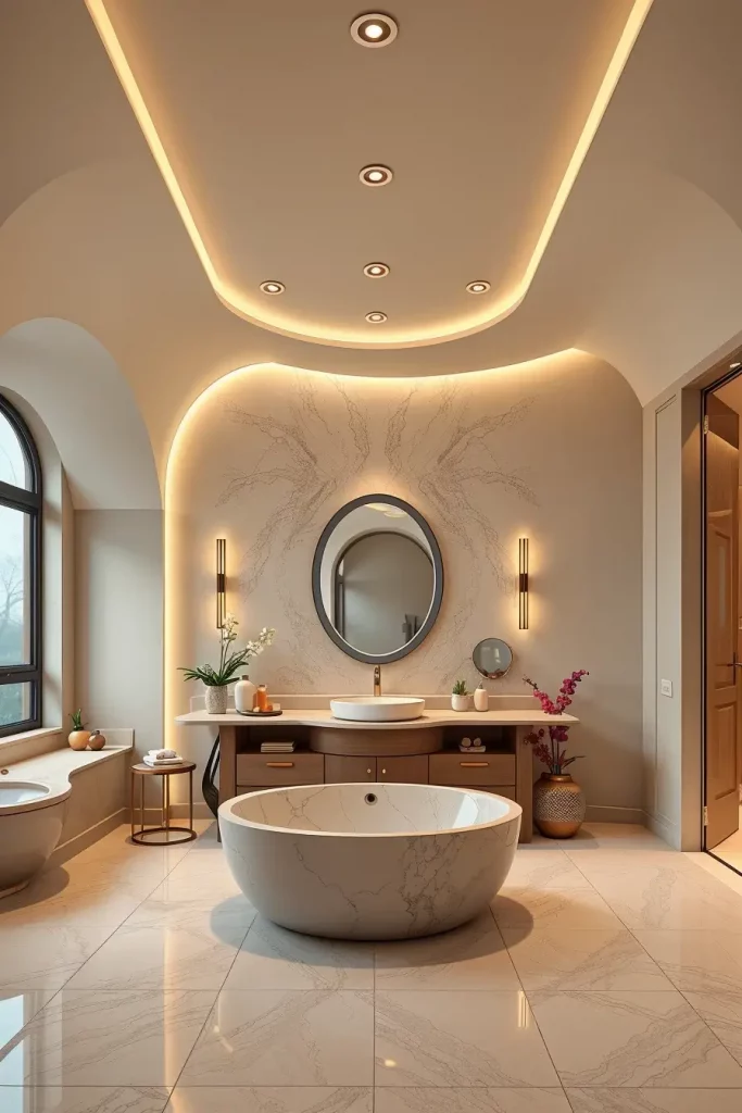 I usually suggest built-in LED strips along the lines of curved ceilings, backlit oval mirrors, and sculptural pendant lamps above freely standing tubs. The combination of these lighting fixtures ensures that modern curved shapes and shapes are highlighted and that there is a layered light which is used to groom and relax as well as control the ambience. Lighting is designed as a part, not as the addition, of architecture.
