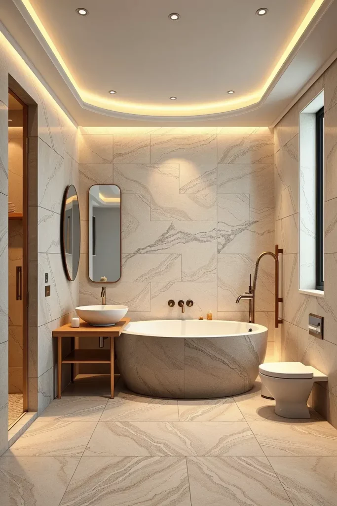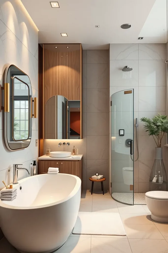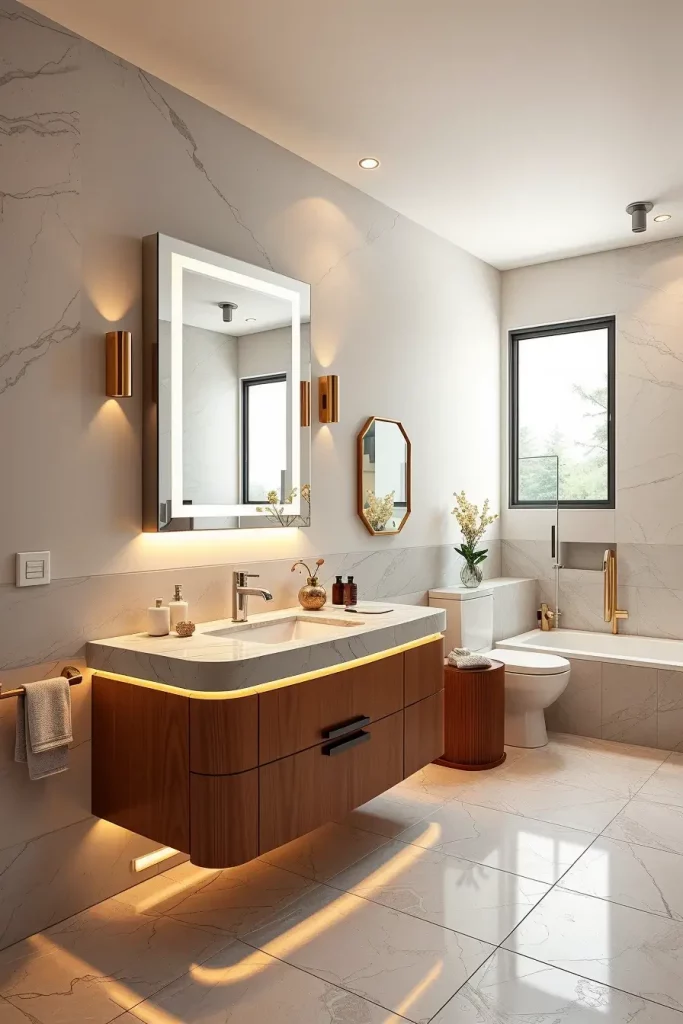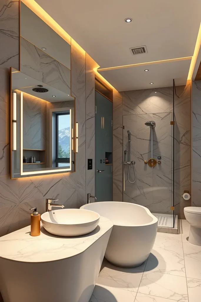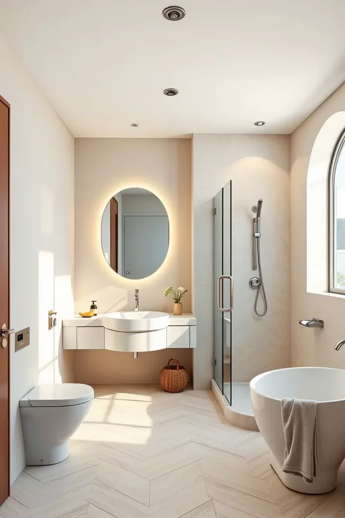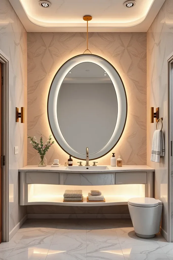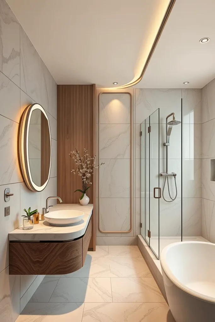 I usually suggest built-in LED strips along the lines of curved ceilings, backlit oval mirrors, and sculptural pendant lamps above freely standing tubs. The combination of these lighting fixtures ensures that modern curved shapes and shapes are highlighted and that there is a layered light which is used to groom and relax as well as control the ambience. Lighting is designed as a part, not as the addition, of architecture.