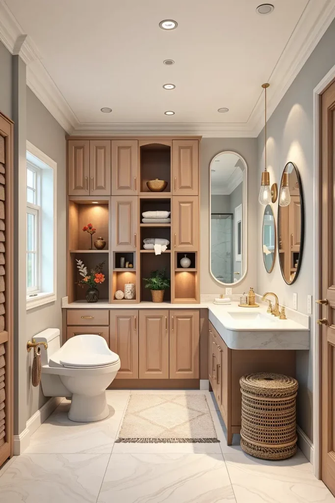 I make use of tall cabinets, in-wall niches and drawers under vanities with soft-close mechanisms. Rounded profiles make sure that the storage becomes a part of the architecture as opposed to breaking it. The surrounding surfaces are well matched with the materials and finishes to ensure cohesion.