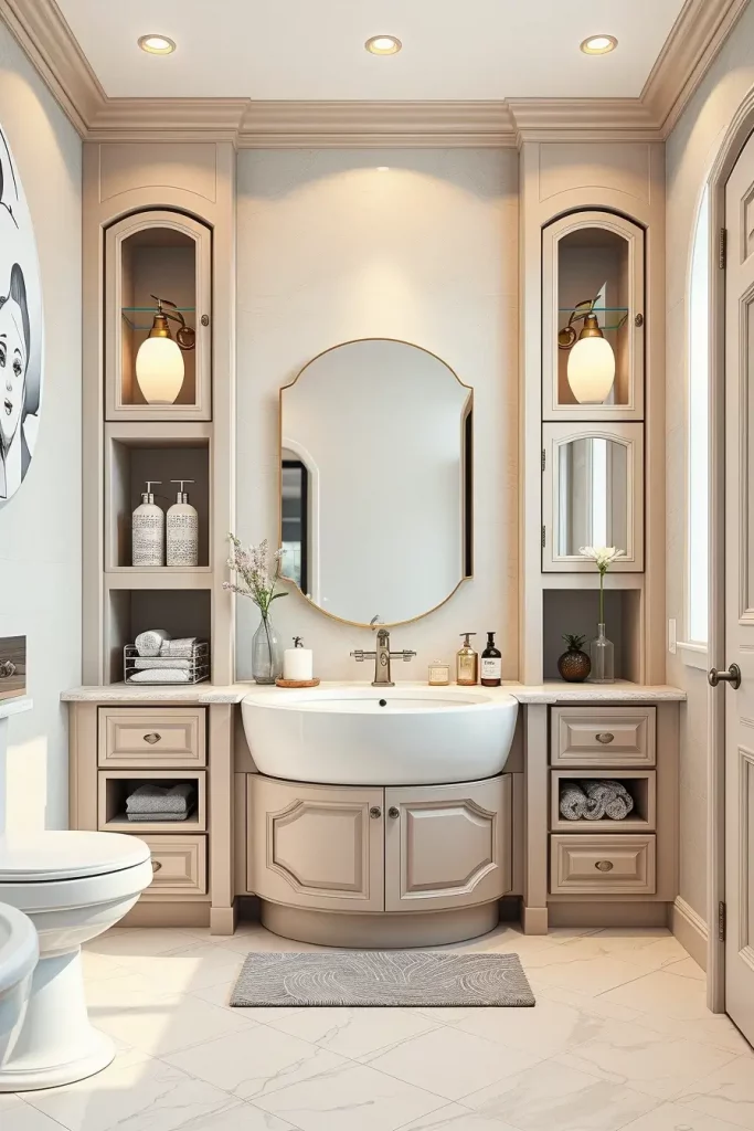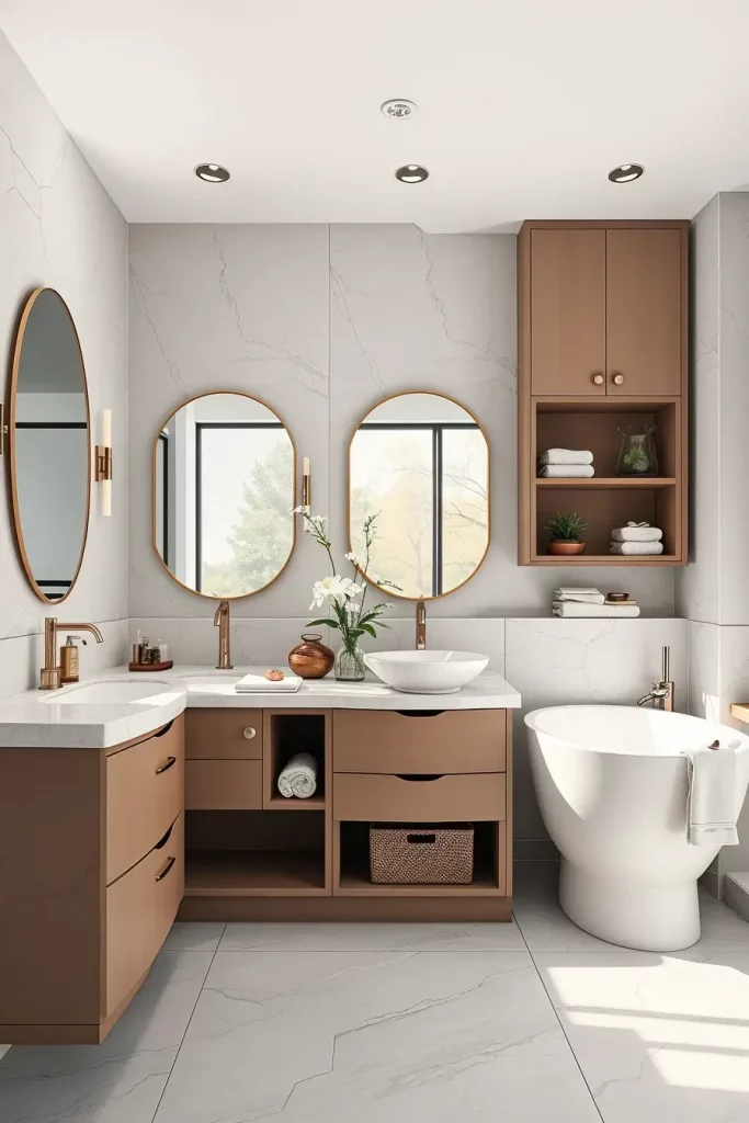The rounded corners of the custom vanities, oval storage units, and sculptural shelving enable the maximum storage space with soft visual look. These items make the bathroom more practical and meaningful, making it look custom-made and purposeful.
