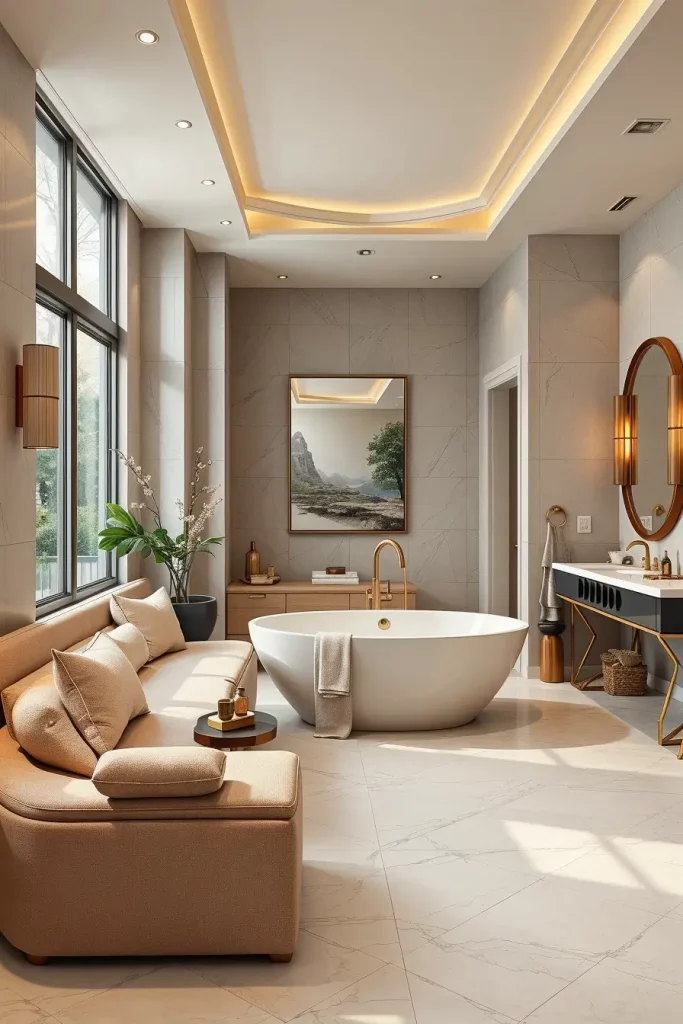 The furnishings are conscious and peaceful. The oval soaking tub located next to a window, the sculptural vanity with the integrated light, and the minimalistic seating items turn the bathroom into the relaxation place. The use of natural stone surfaces, warmer neutrals, and slight contrasts support a spa-like ambiance and at the same time are clearly modern.
