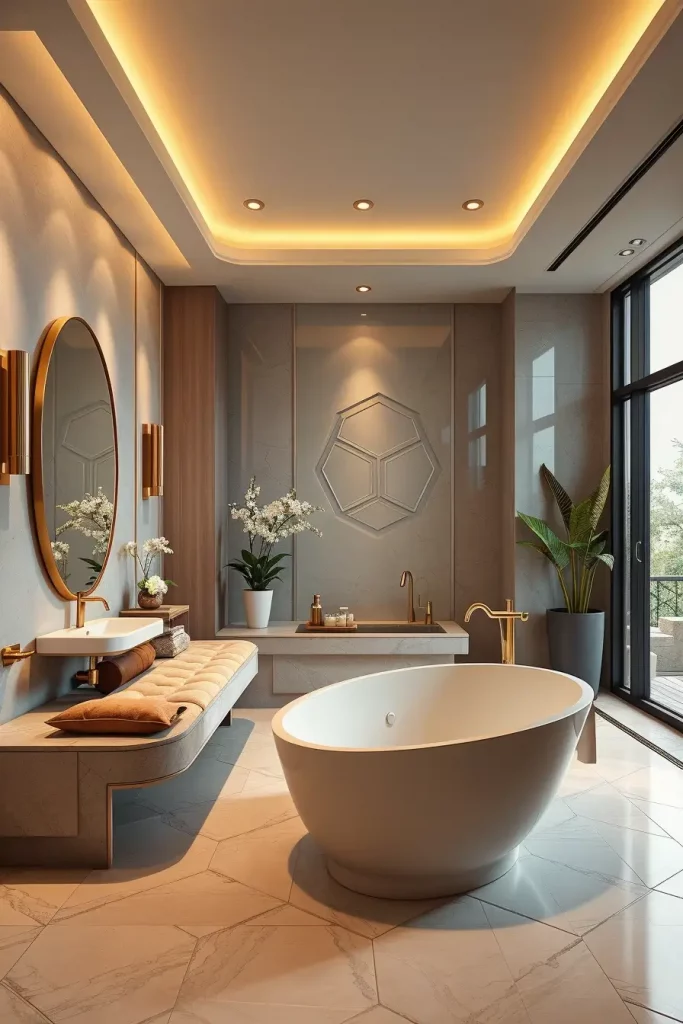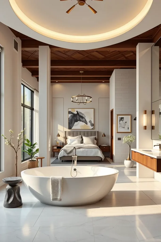 Practically, oval shapes affect the floor layouts, ceiling details, etc. The movement is visually directed with the use of oval-shaped rugs, curved floor inlays, and rounded ceiling recesses to ensure that the design does not disintegrate. There is also the advantage of furniture placement, whereby the designer vanities and tubs do not feel out of place.