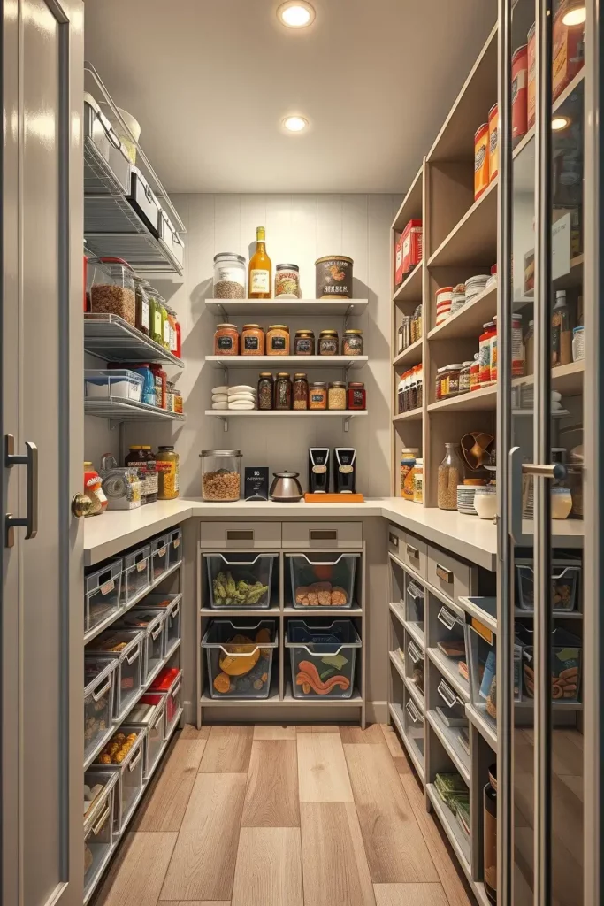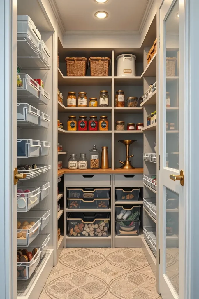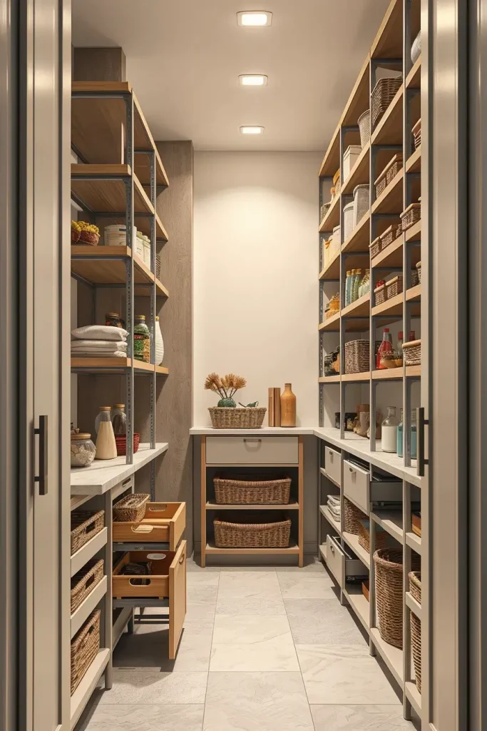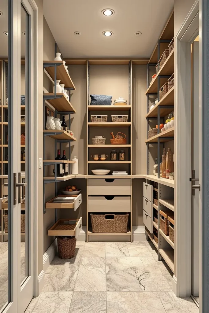 I suggest wire or mesh baskets to be used to allow ventilation and easy cleaning. Metal glides and wooden racks are luxurious but convenient in touch. The multiple levels of baskets will be installed so that the goods are visible and can be reached without being crowded on the shelves. I normally combine these with adjustable shelving to be even more flexible.