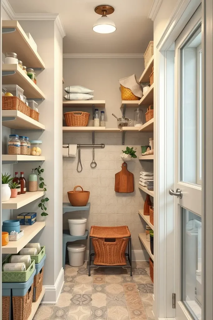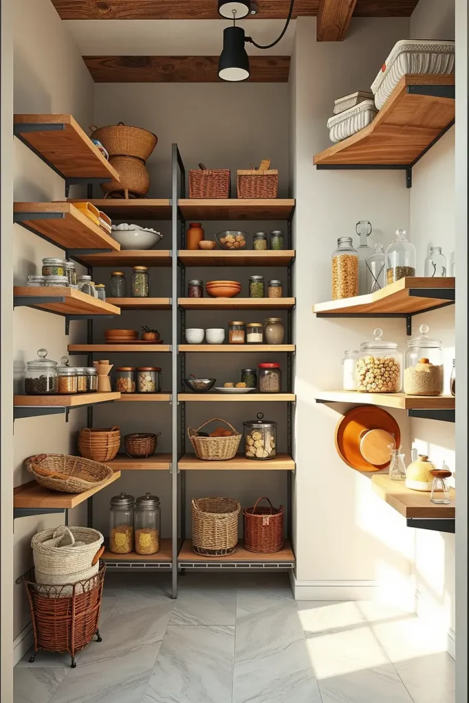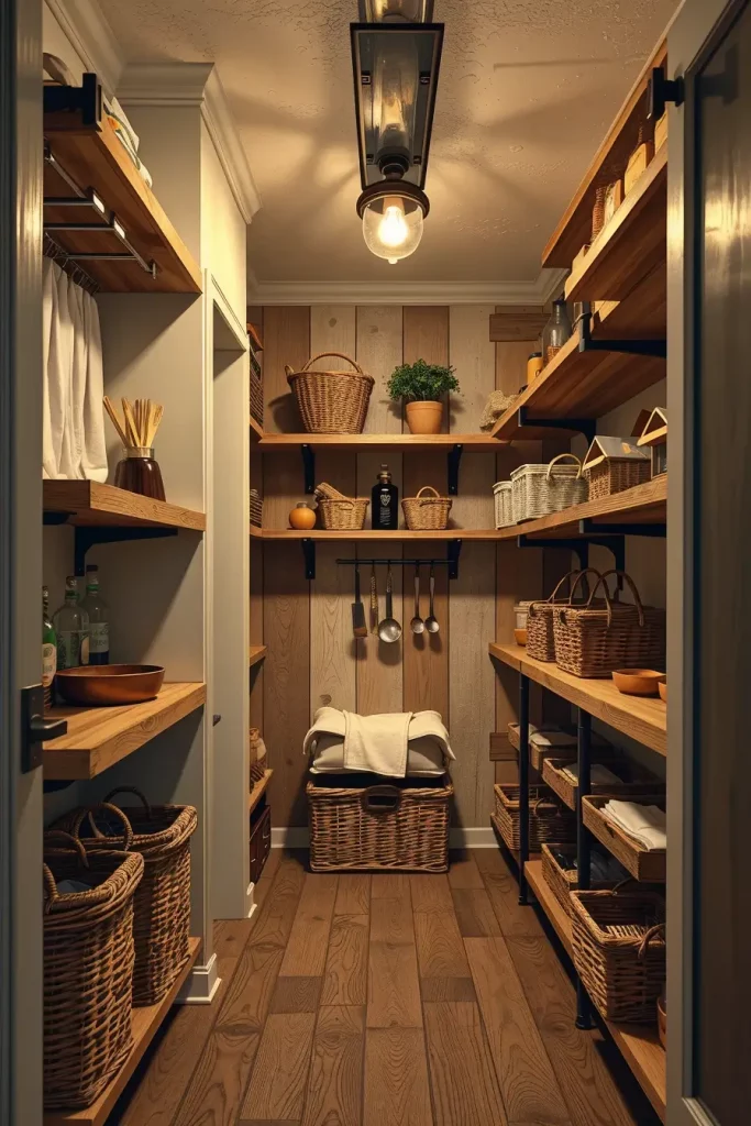 The selection of furniture also involves open wooden shelves, wicker baskets, and rustic iron rails. I also think it is preferable to pair them with neutral tones on the walls, such as soft beige or off-white; this way the pantry does not look overweight.