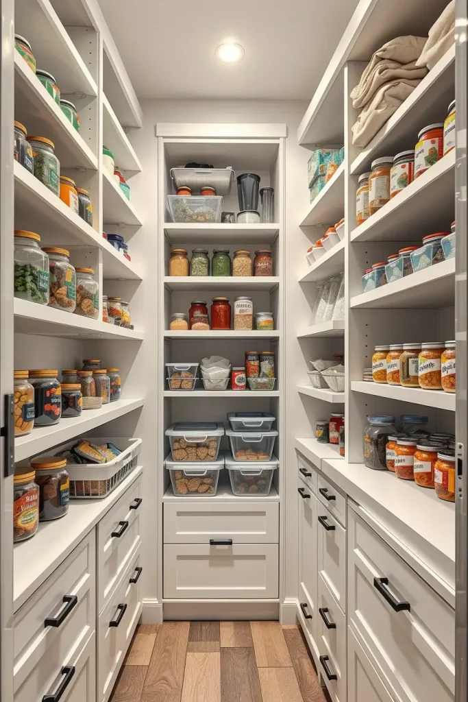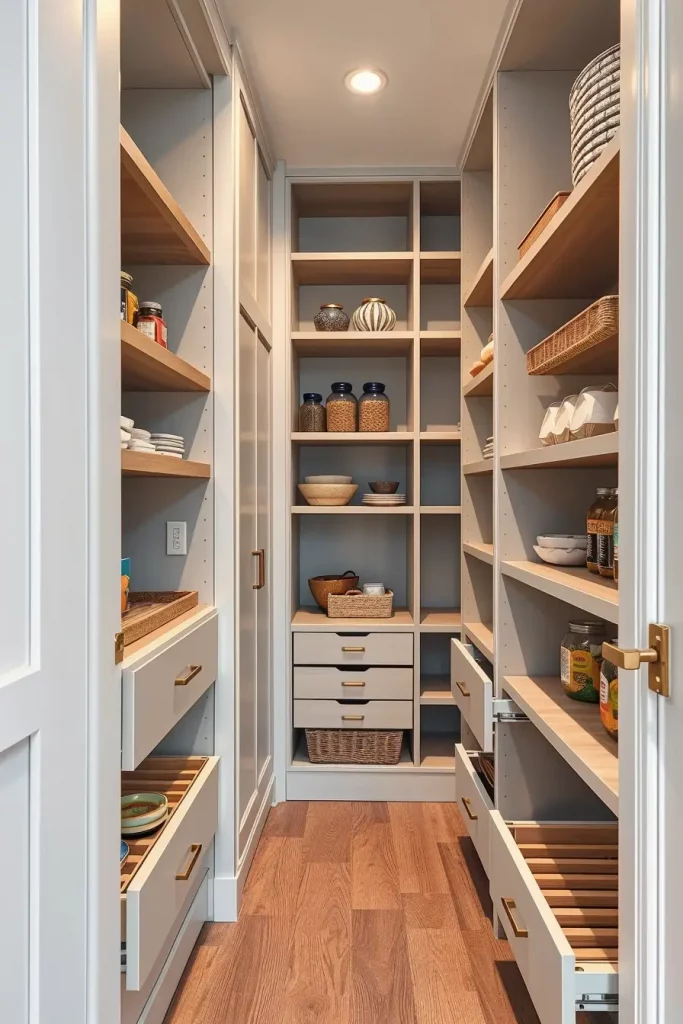 In creating a small walk-in pantry, I would always ensure that the emphasis is put on functionality and tidiness, and the drawers are always built-in to provide the needful. They offer orderliness and convenience of access to smaller goods such as snacks, baking supplies, or kitchen utensils. In my case, inbuilt drawers give permanency and class that would convert a plain pantry to a fully customized storage room.