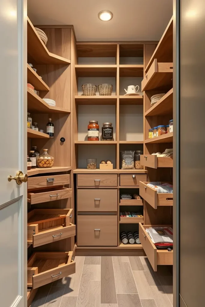 I like full-extension slide drawers so that I can see everything in them. Soft-close, noises and wear are avoided, and different depths serve different purposes, the shallow drawers used to hold spices, the deep ones to store dry goods/small appliances. To match a modern pantry design, natural wood finish or matte paint are used, which is the guarantee of a visual harmony with the rest of the kitchen.