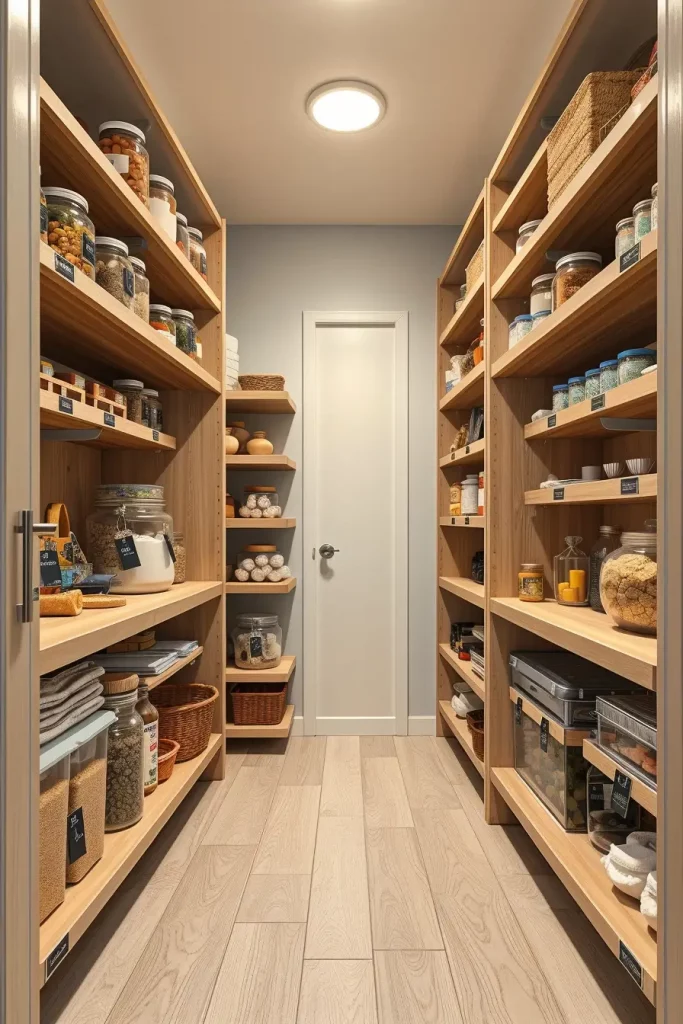 The decor of a walk-in pantry that is narrow can be either broken or completed by the flooring. I would normally opt to use the long lasting, waterproof ones such as vinyl planks or ceramic tiles. Such materials are very easy to maintain and are stylish and suitable in high traffic pantry areas.