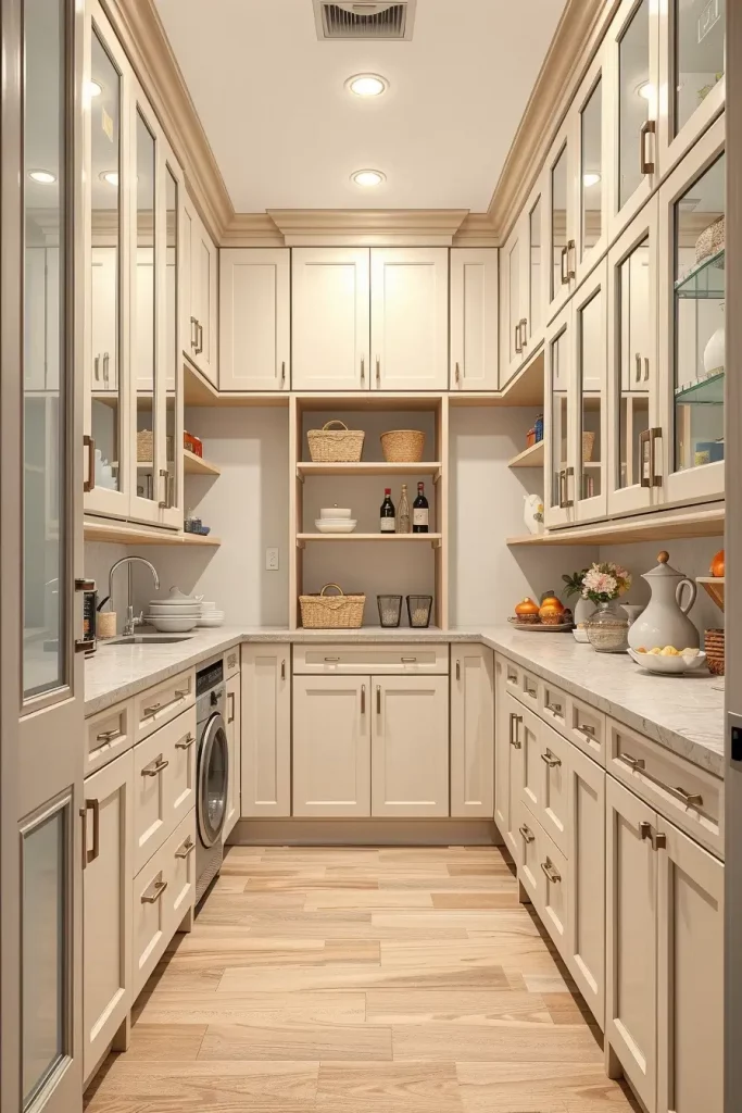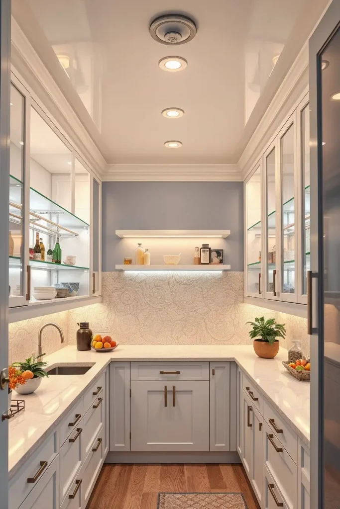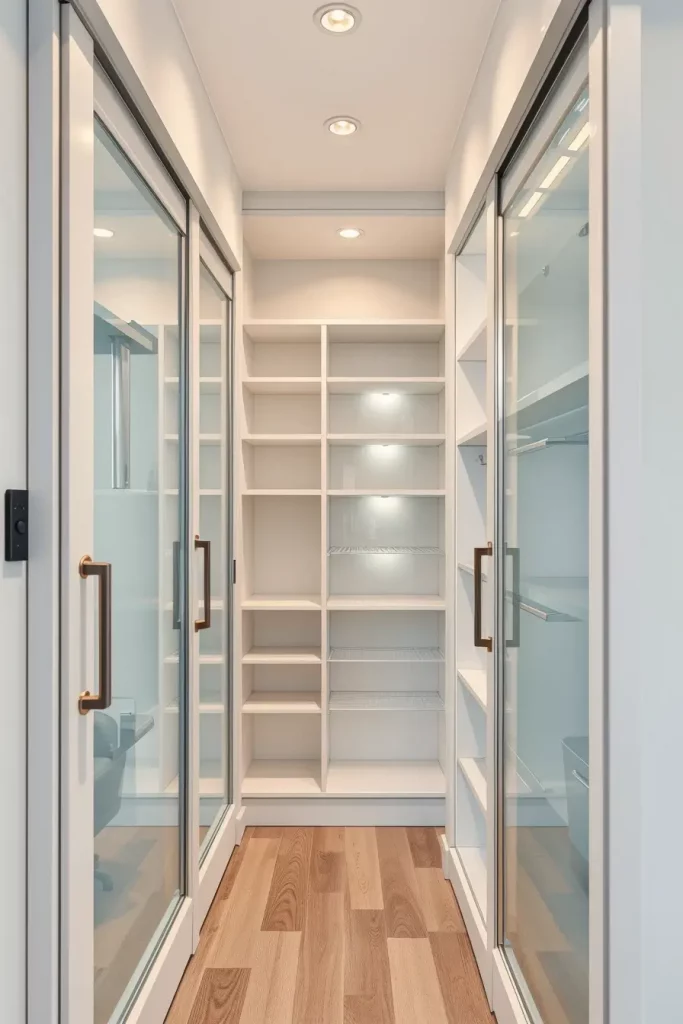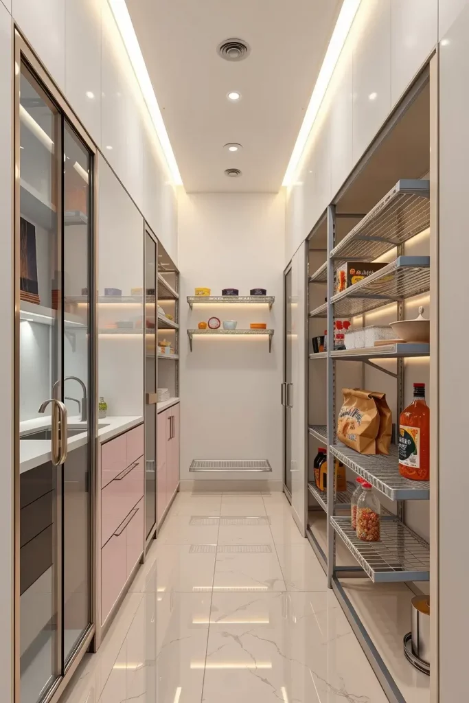 Reflective materials are a good idea in order to make a small walk-in pantry look bigger. I tend to utilize glass, shiny tiles, and smooth polyished metal shelves to provide the effect of depth and brightness. Natural and artificial light are reflected off these surfaces and this creates an aperture into what would otherwise seem to be a small passageway. The process is relatively easy but transformational – ideal to the homeowners who want style and functionality to harmonize.