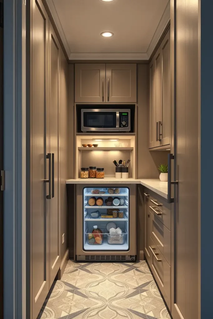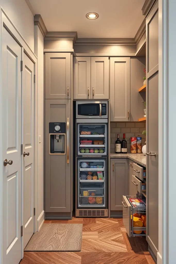The appliances are to be directly included in the walk-in pantry format to save counter space in the primary kitchen. I tend to create pantry areas that can include a mini-fridge, a microwave or even a compact coffee maker. This renders food preparation more effective and leaves the kitchen tidy.