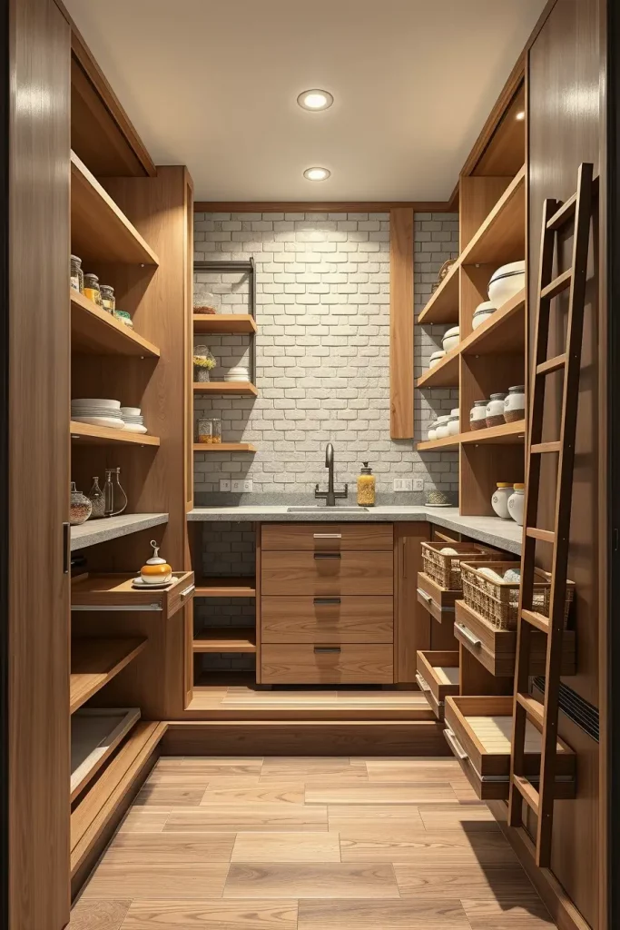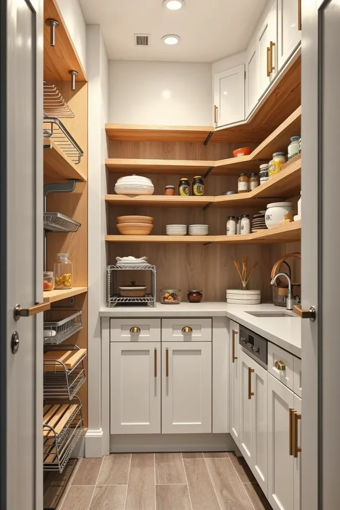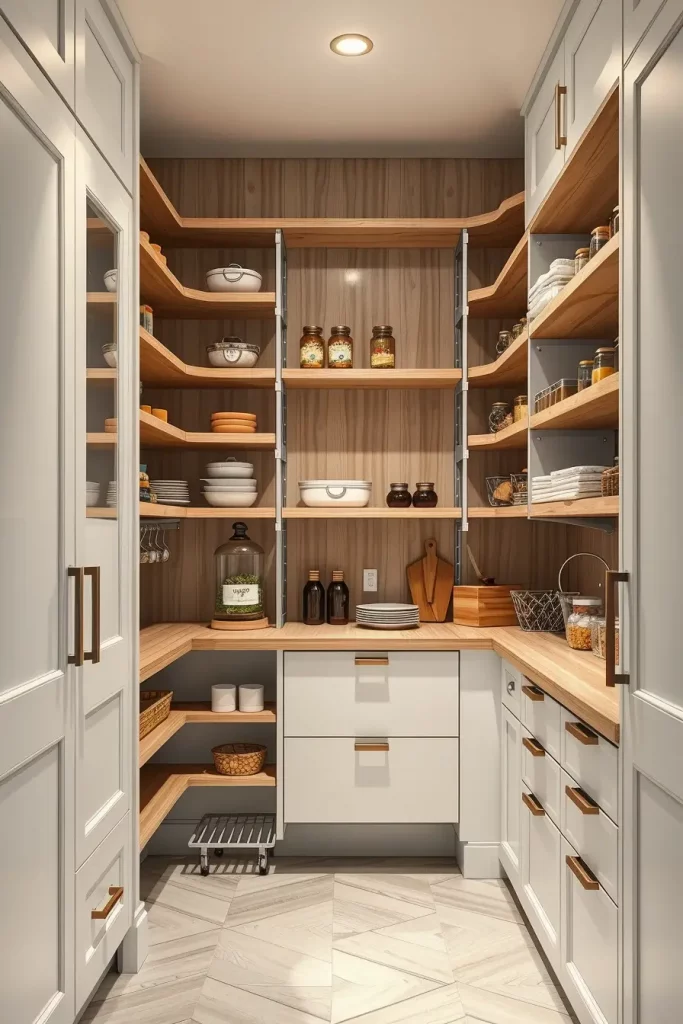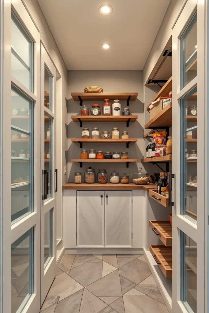 Each shelf ought to be functional. I would suggest to have deep shelves to keep bulk items and shallow shelves to store spices or condiments. It is also helpful especially to include pull-down racks close to the top of the list where people are more likely to be shorter. The use of such materials as bamboo or white oak contributes to the warm atmosphere and still preserves the modern style.