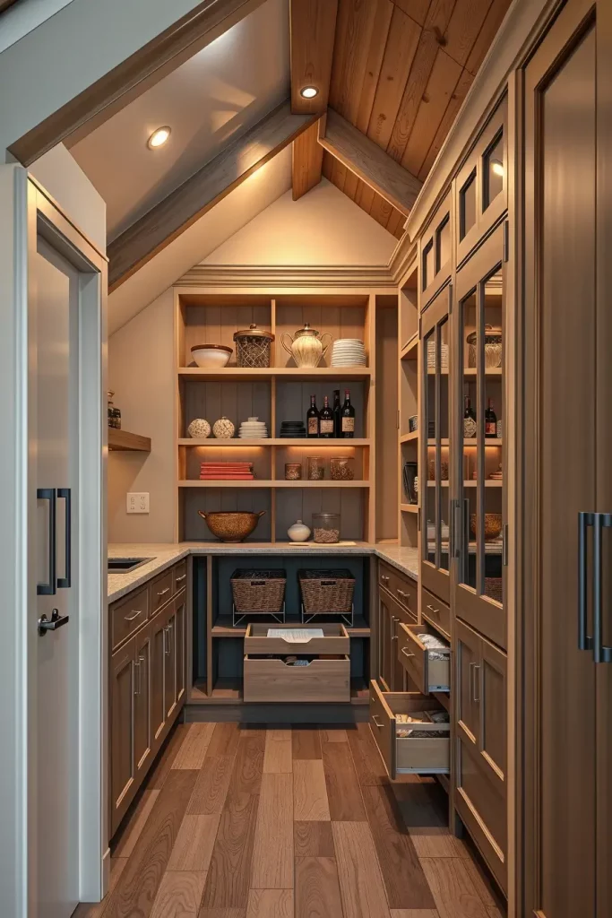 Among the most innovative narrow pantry designs, the use of the space under the staircase to make a hidden storage treasure is a great idea. I would use this in the homes which do not have traditional pantry but yearn functionality. The sloping ceiling provides a continuation of tiered shelving and storage drawers.