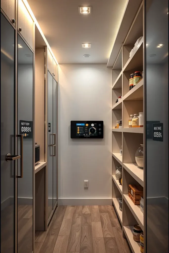 To layout, I would have hidden LED lights, which are connected to motion detectors so that the pantry is only lighted when being used. Temperature and light intensity can also be controlled on a small intelligent display or hub at the entrance.