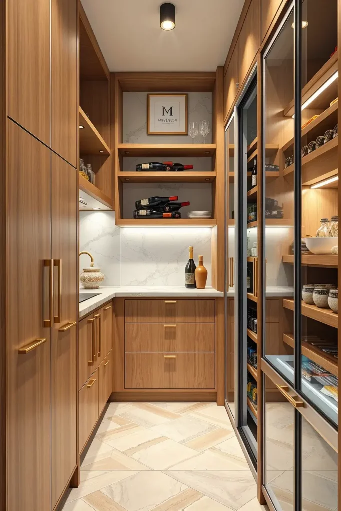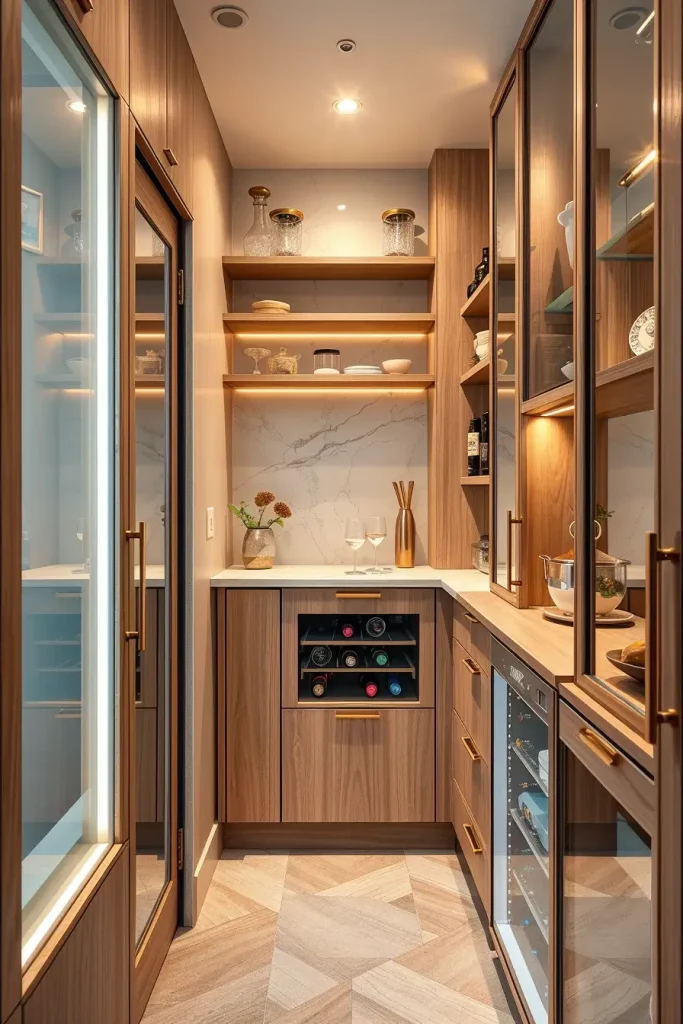Each feature is supposed to have a purpose. As an illustration, I would have the cabinet door doors plain glass, but frosted to create a depth, with LED strips placed behind the shelves, which are also hidden to provide a luxurious effect. One can make a statement out of an ordinary pantry with the help of a slender, upright wine rack or a refrigerated draw. Such upgrades do not only improve on convenience, but also increase the value of the home.