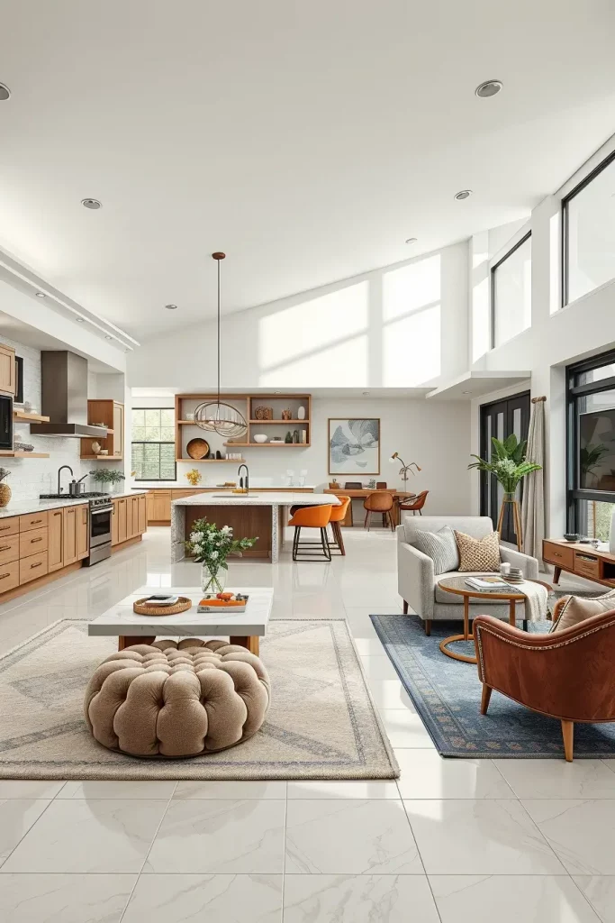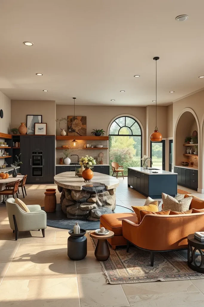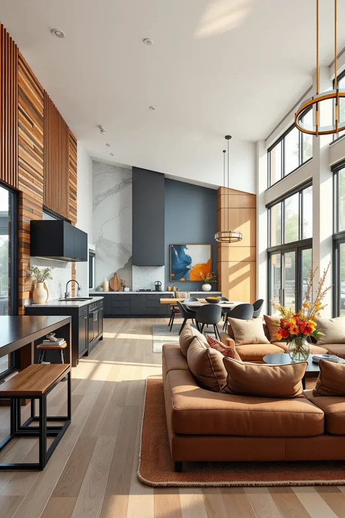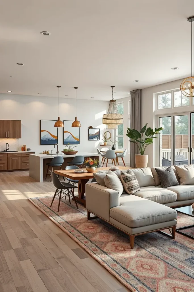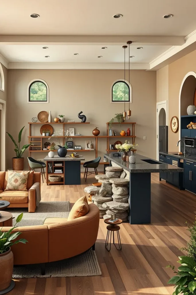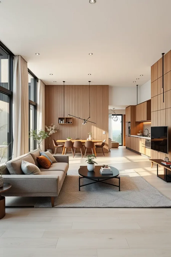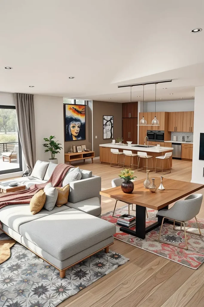 I would suggest combining natural wood cabinetry with neutral walls with statement sofas in earthy colors such as terracotta or olive green. Biophilic touches, including natural stone surfaces or indoor plants, can also be added to the interior to improve the relaxing ambiance. The open space is made practical by use of smart furniture such as expandable tables and hidden media centers without compromising on style.