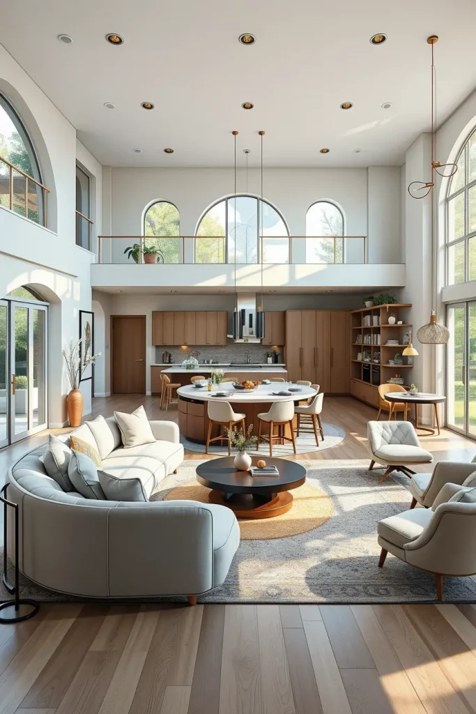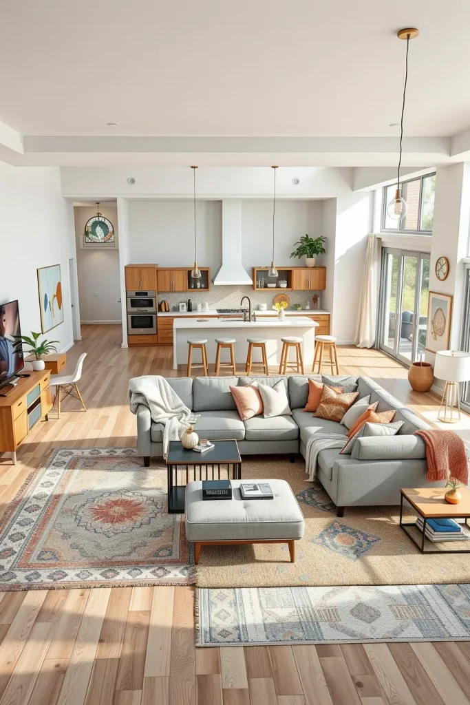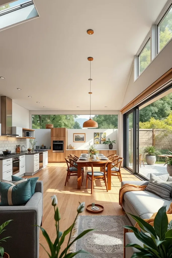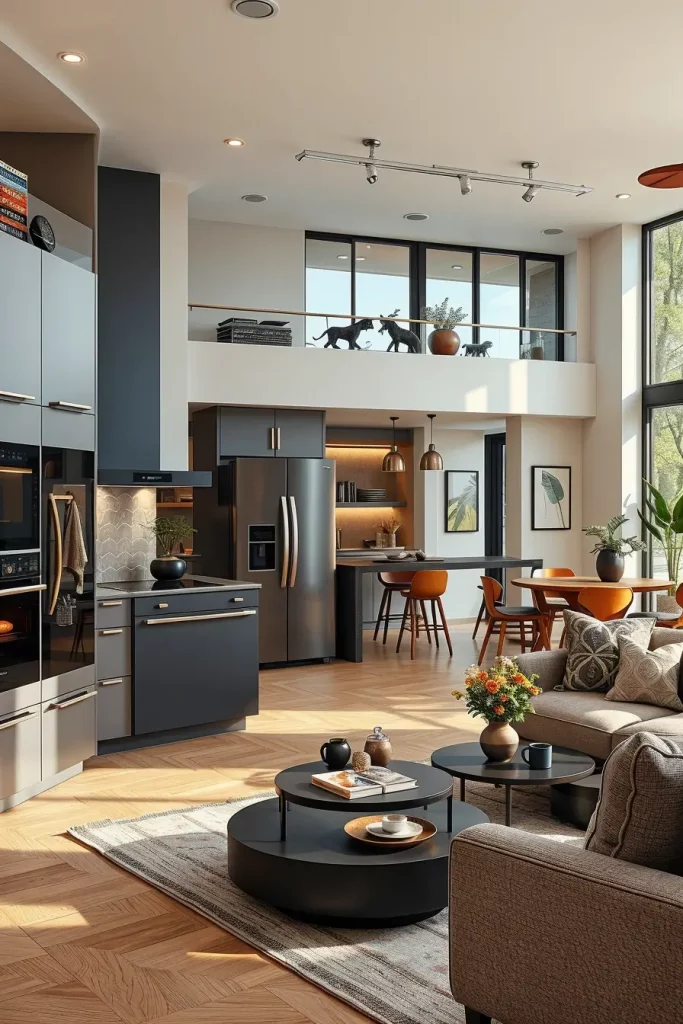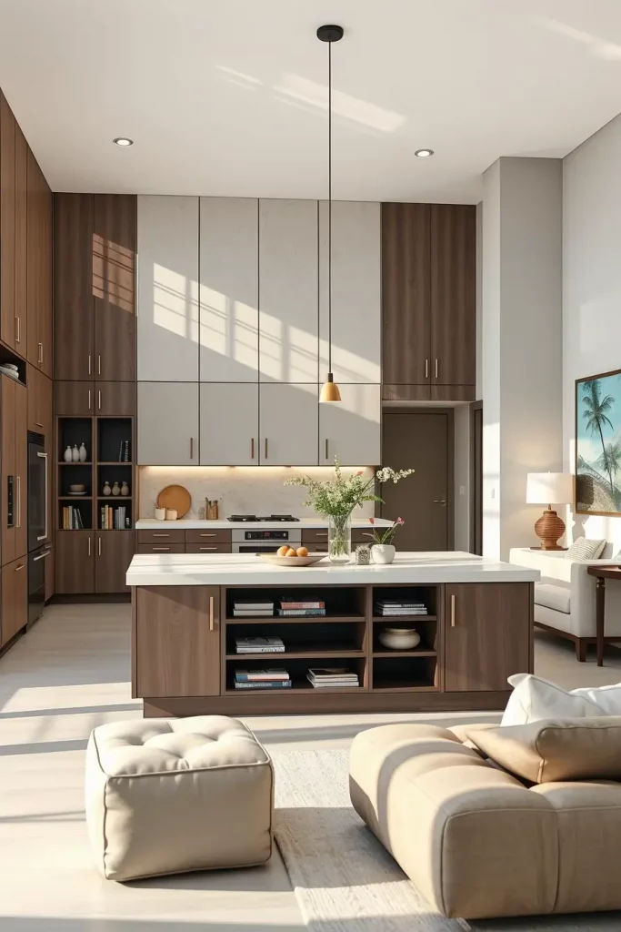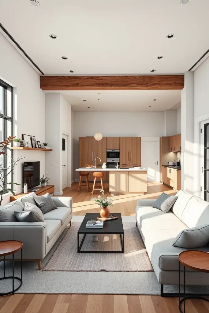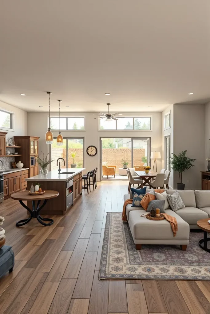 I would suggest combining natural wood cabinetry with neutral walls with statement sofas in earthy colors such as terracotta or olive green. Biophilic touches, including natural stone surfaces or indoor plants, can also be added to the interior to improve the relaxing ambiance. The open space is made practical by use of smart furniture such as expandable tables and hidden media centers without compromising on style.