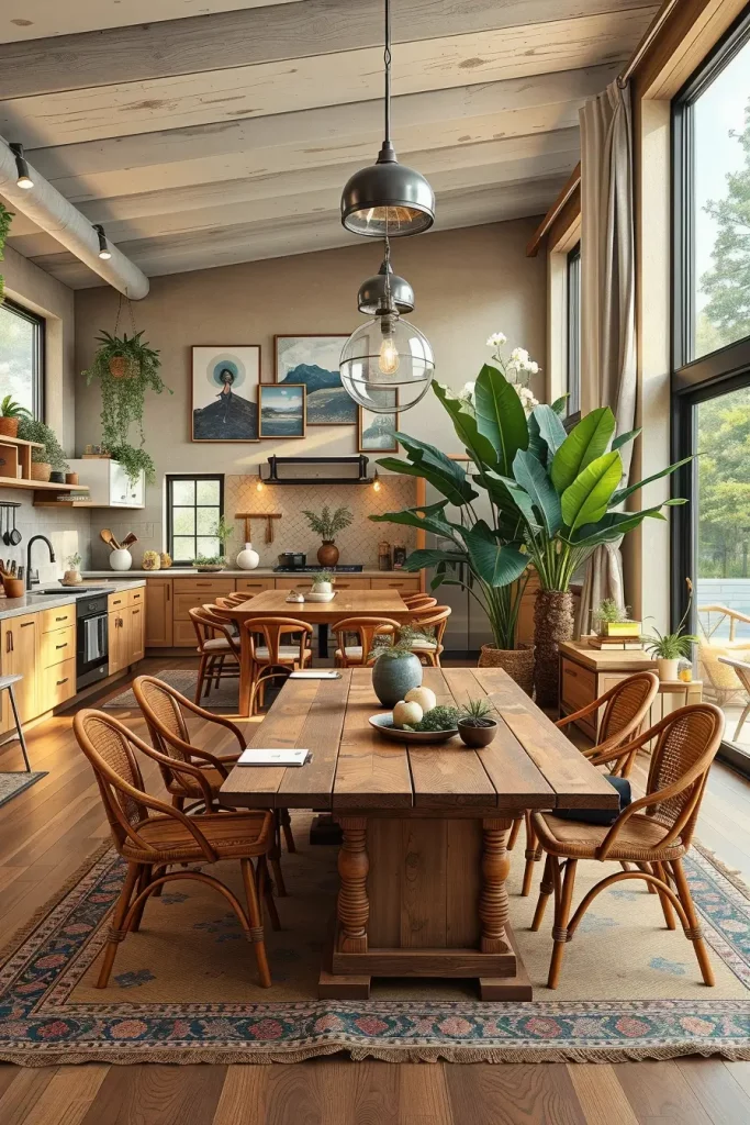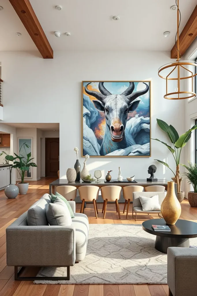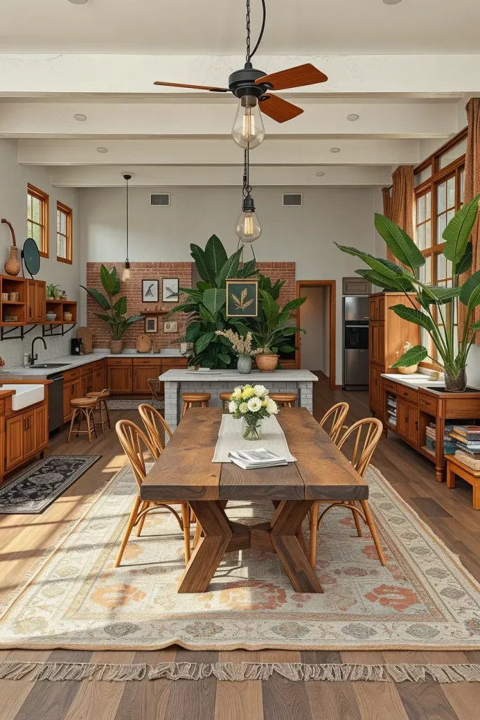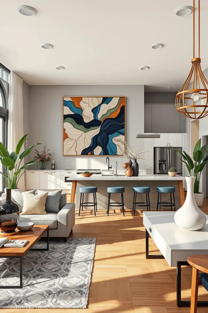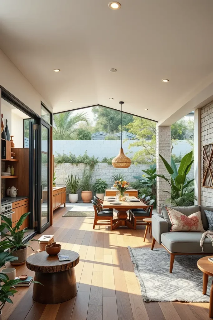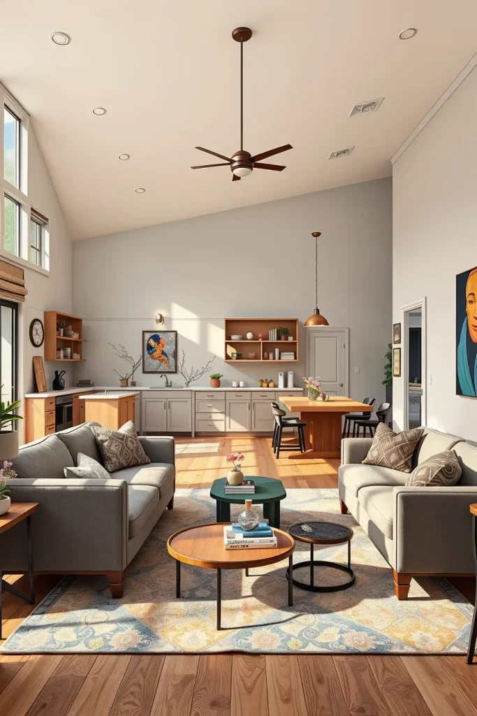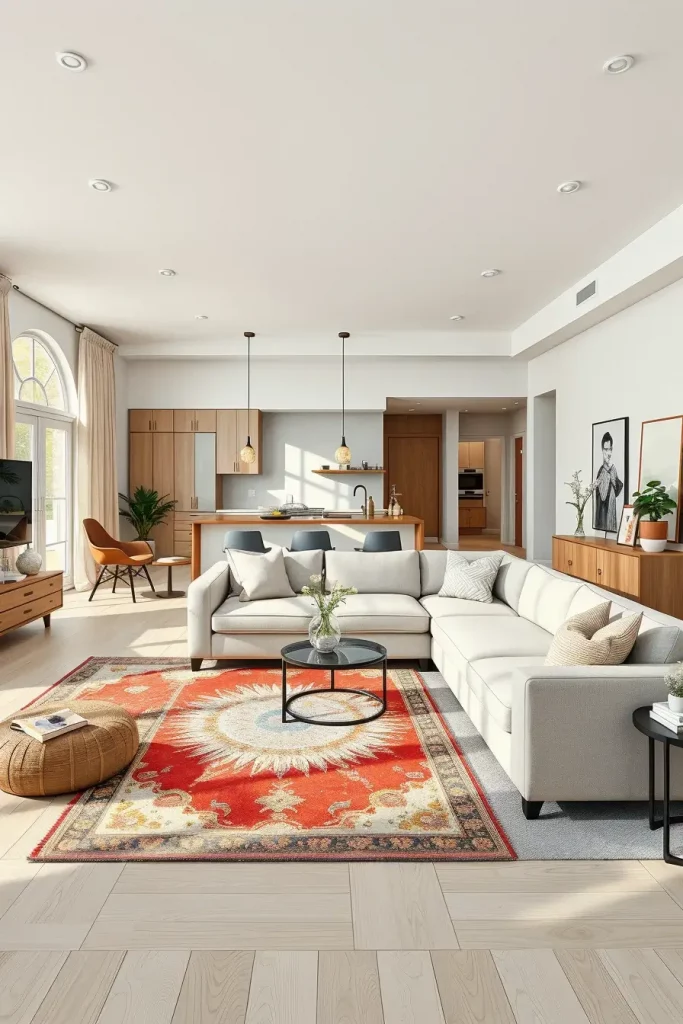 I would suggest combining natural wood cabinetry with neutral walls with statement sofas in earthy colors such as terracotta or olive green. Biophilic touches, including natural stone surfaces or indoor plants, can also be added to the interior to improve the relaxing ambiance. The open space is made practical by use of smart furniture such as expandable tables and hidden media centers without compromising on style.