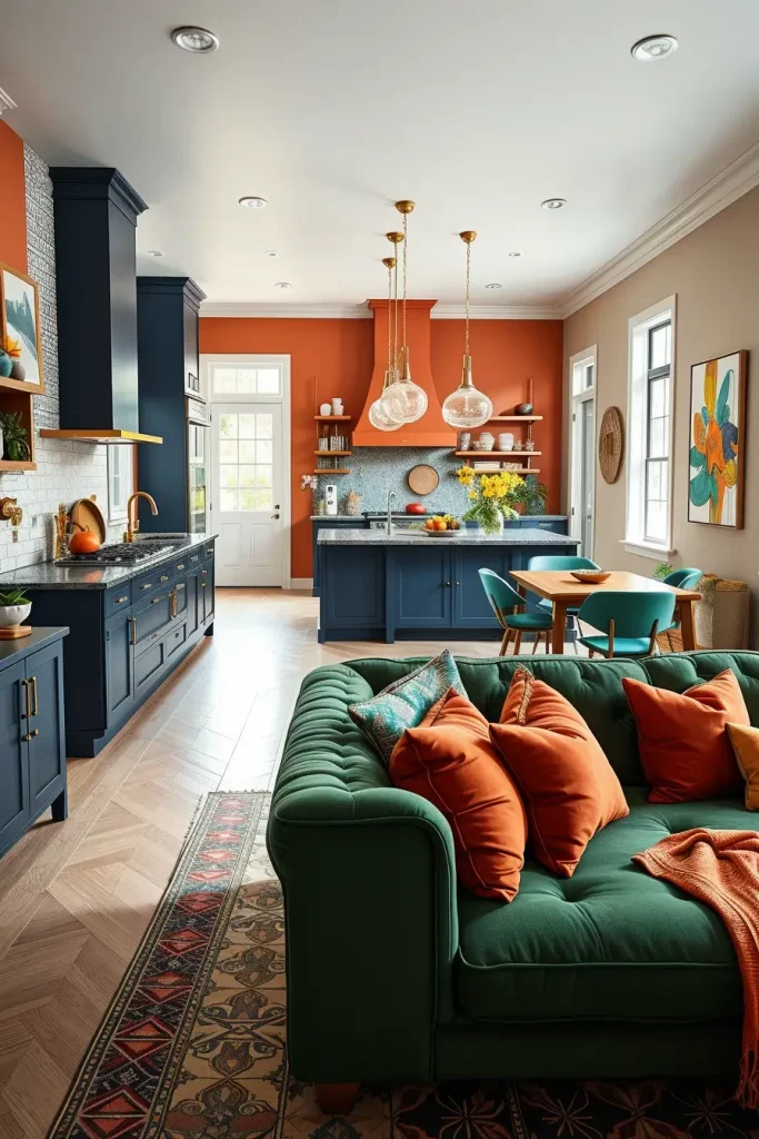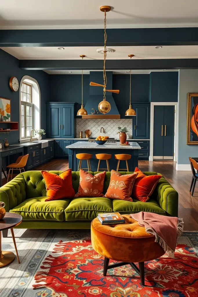 These bold schemes are improved by furniture selection. I would frequently recommend colored cabinetry with contrasting sofas or accent chairs. A deep green velvet sofa may be paired with a navy kitchen island using brass fixtures and warm terracotta cushions may be used to visually tie the two spaces.