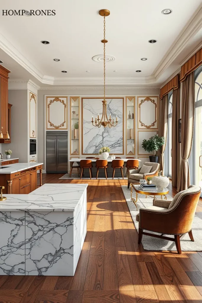 I usually suggest marble islands, quartz countertops, and leather seats. Fixtures of brass or matte black unite the appearance, and hardwood flooring is used to provide warmth. A velvet accent chair or silk curtains can bring the mood of the room to a new level.