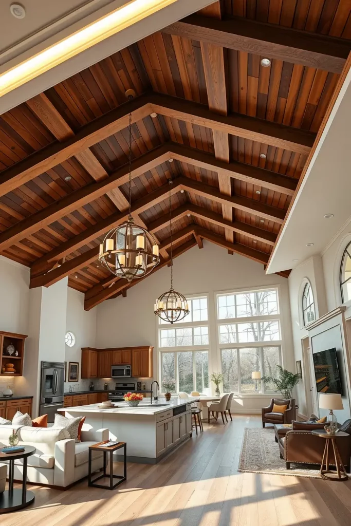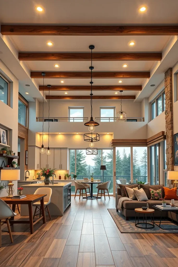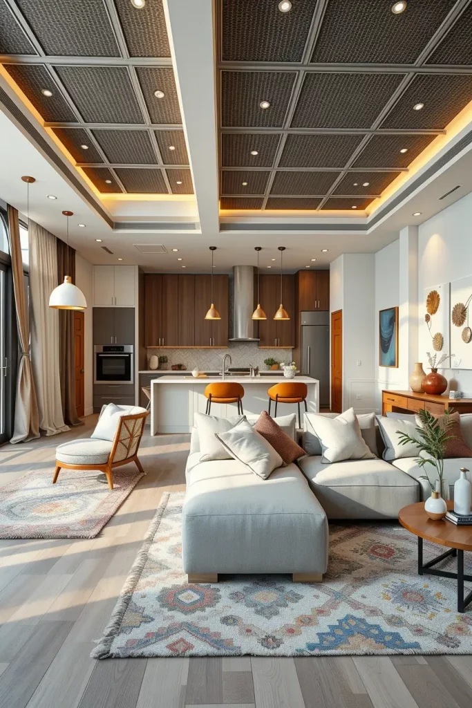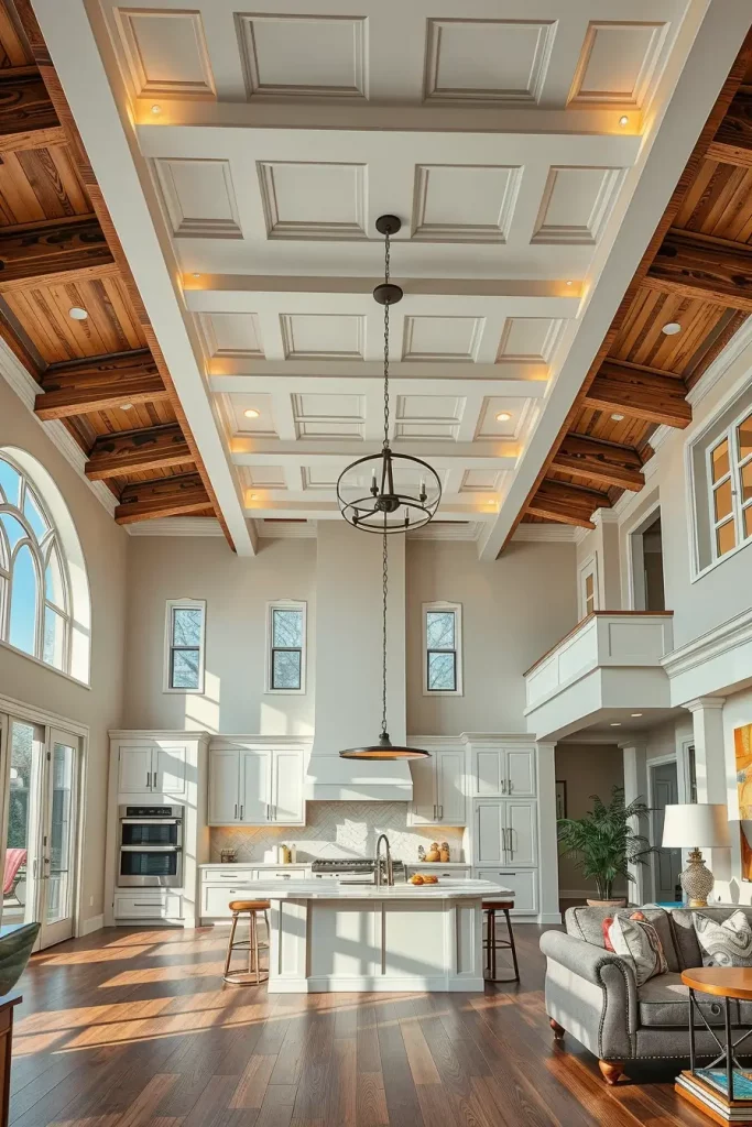 I prefer exposed beam, recessed lighting strips, or 3D panels. I have also included coffered ceilings that are painted in accent colors, and this gives a smooth flow between the kitchen and the living room.