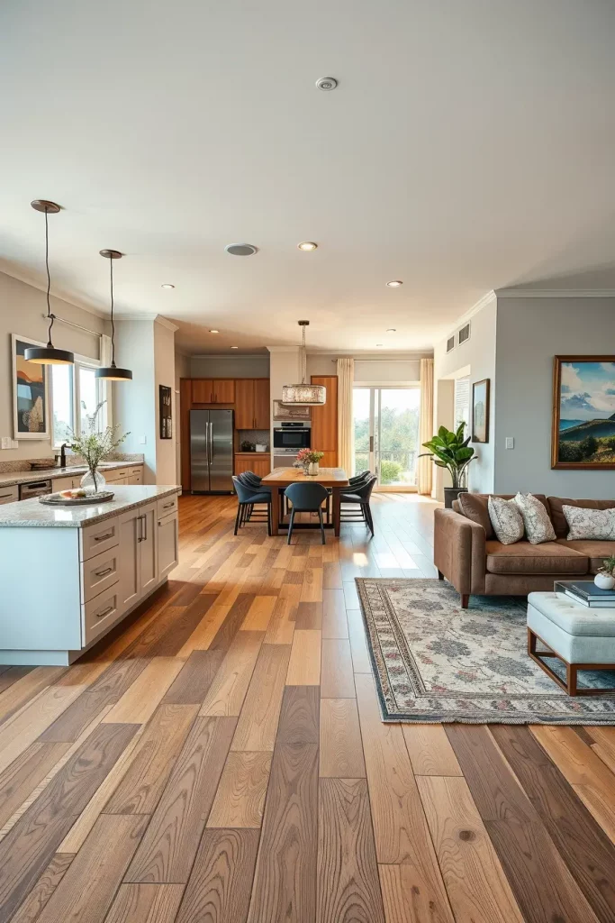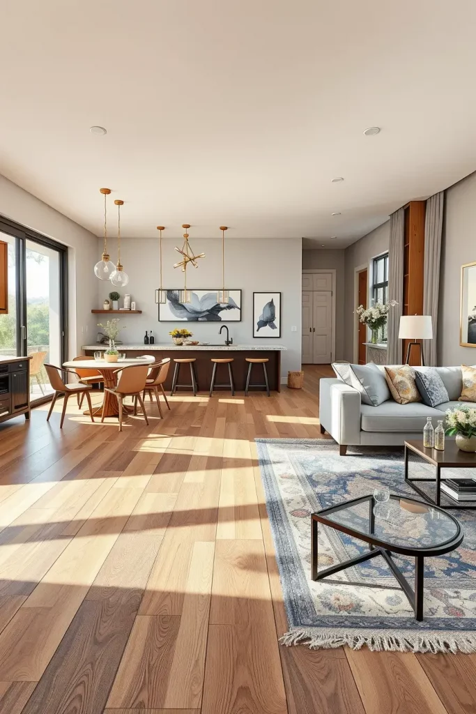I usually suggest wide-plank wood flooring, polished concrete or large-format tiles. Continuity and durability are achieved with these materials, which are ideal in high traffic open layouts. Rugs may then be superimposed to demarcate certain spaces such as beneath a dining table or sofa.