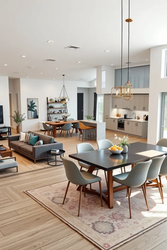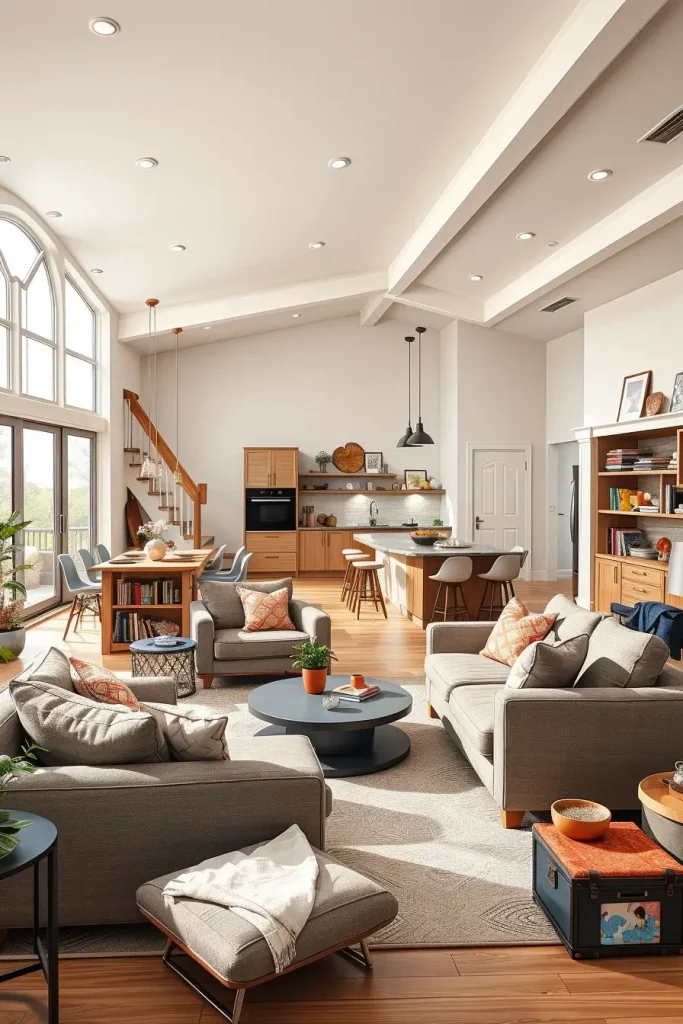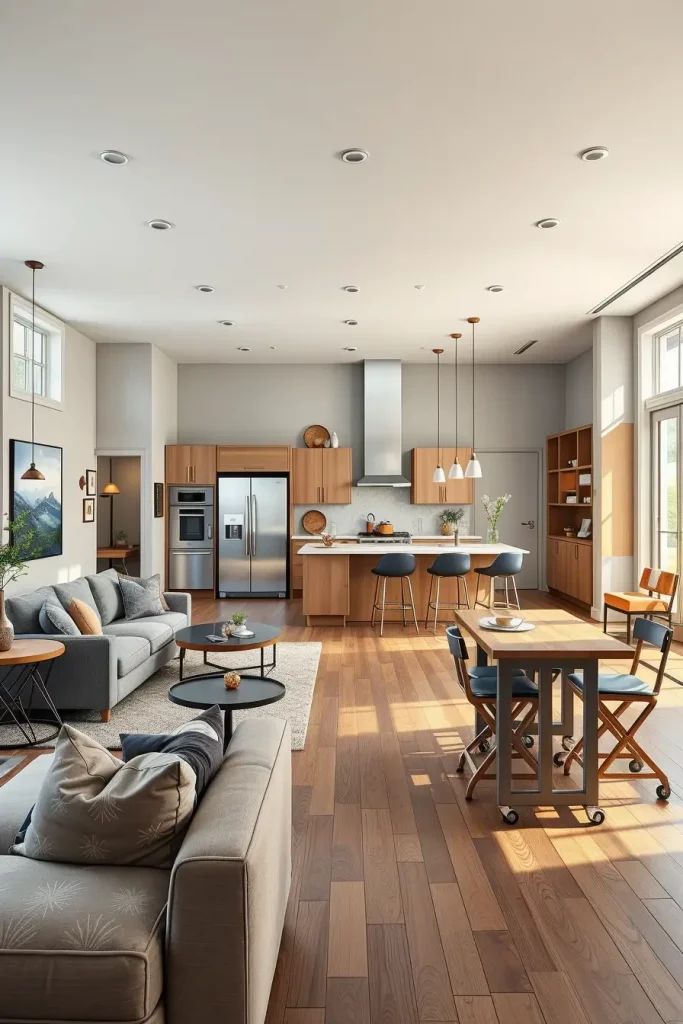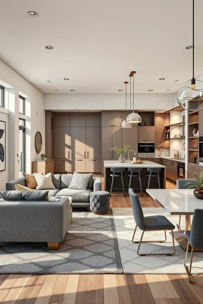 Furniture has a significant role to play. I would recommend such multi-purpose items as extendable dining tables that can perfectly blend into the living room or sectional sofas that can be reconfigured according to the needs. The choice of materials is important as well; durable quartz countertops and performance fabrics will guarantee the long-term use. These products are comfortable as well as protective against daily wear and tear in an open concept setting.