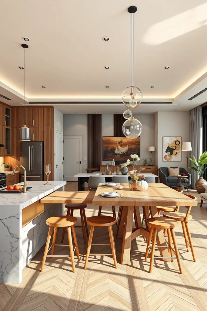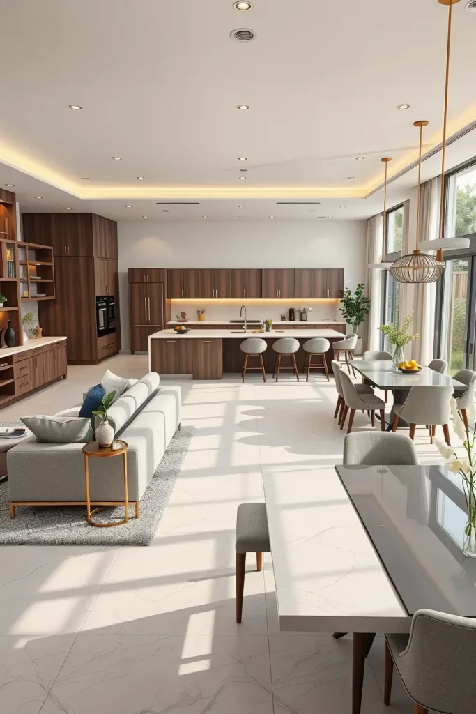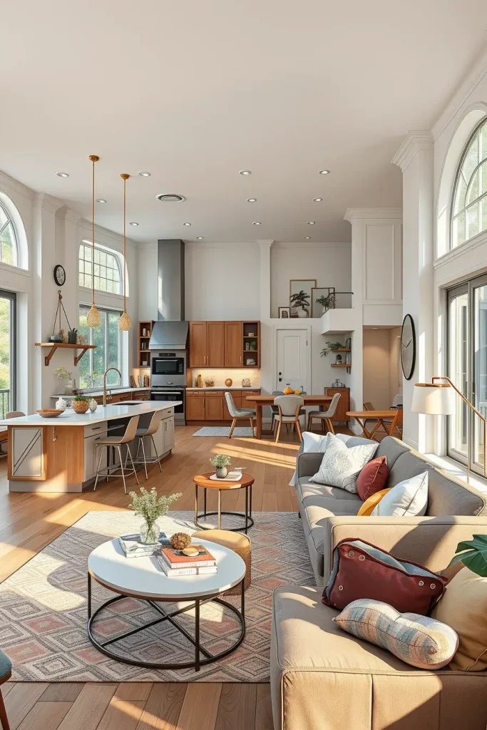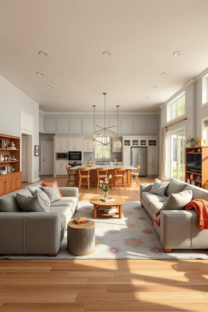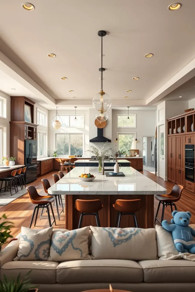 Furniture has a significant role to play. I would recommend such multi-purpose items as extendable dining tables that can perfectly blend into the living room or sectional sofas that can be reconfigured according to the needs. The choice of materials is important as well; durable quartz countertops and performance fabrics will guarantee the long-term use. These products are comfortable as well as protective against daily wear and tear in an open concept setting.