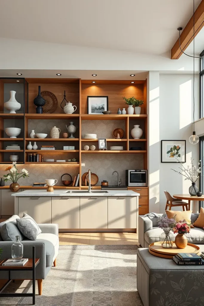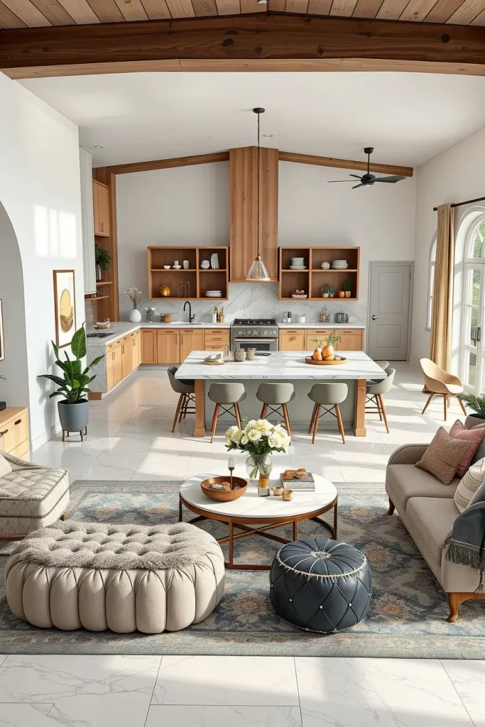 Ottomans, accent chairs, and open shelves are some of the items that combine these spaces. I like floating shelves in kitchens that extend to the living room with books and decor on them, as well as dishes and glassware.