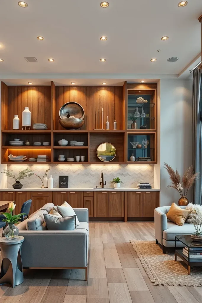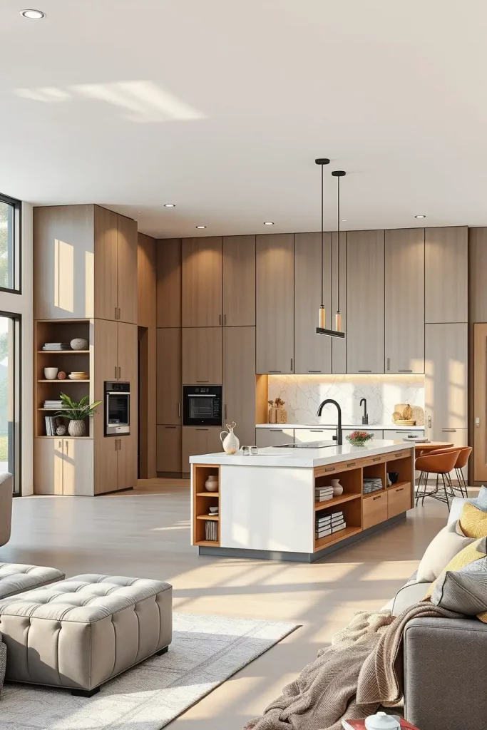 Hidden storage is a game-changer when it comes to working with an open kitchen living room. The absence of conventional walls to divide spaces can easily be filled with clutter. This is why it becomes necessary to combine discrete storage units, i.e. cabinets that look like wall panels, ottomans with incorporated compartments, or benches with drawers. These aspects make the space light and at the same time everything is in place.