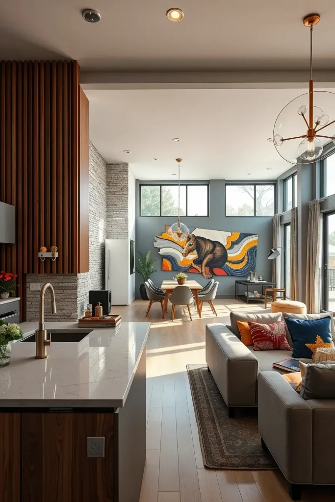 Wood slats, stone cladding, or geometric wall panels are some of the materials that I usually recommend. These not only provide character, but also show distinctly where one space begins and another one starts. As an illustration, the accent wall behind a sofa is dark-colored, which grounds the living area, whereas the kitchen is light-colored, which makes it contemporary and lively.