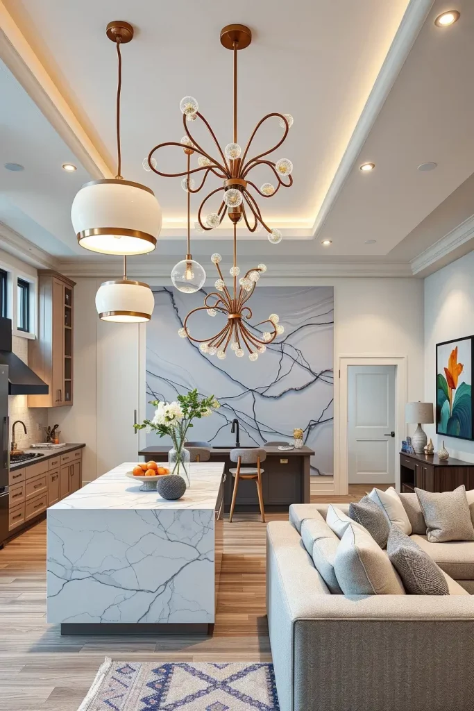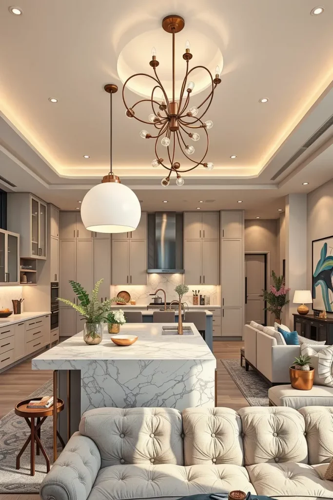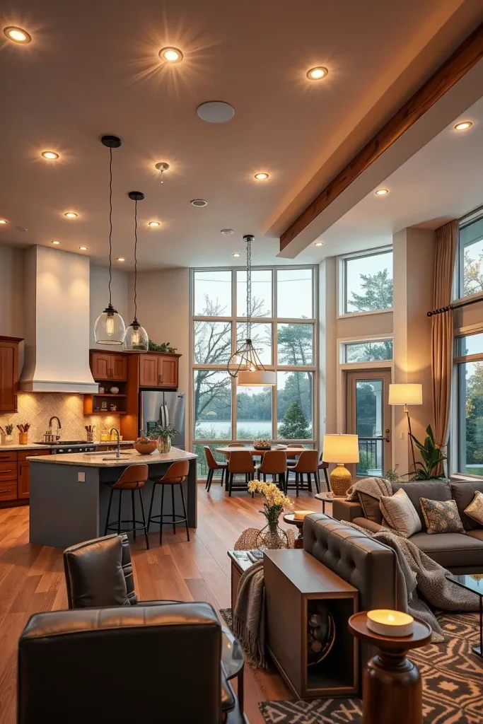I would always suggest that lighting fixtures should be chosen to match the furniture and color scheme. As an illustration, matte black pendant lights with brass decorations look great with neutral kitchen cabinets and comfortable sofas in the living room. The recessed LED strips along the perimeter of the ceiling can be added to provide a faint glow that can emphasize architectural features. These layers of light are used to create a balance between the dining, cooking and lounging areas.