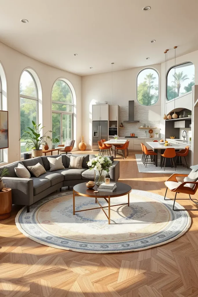 I usually suggest curved sectional that does not establish hard boundaries and outlines the living area. They are accompanied by round area rugs which make the space friendly and unified. Even the rounded edges of kitchen islands help to create this feeling of continuity.