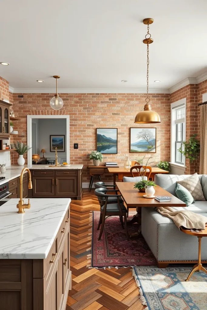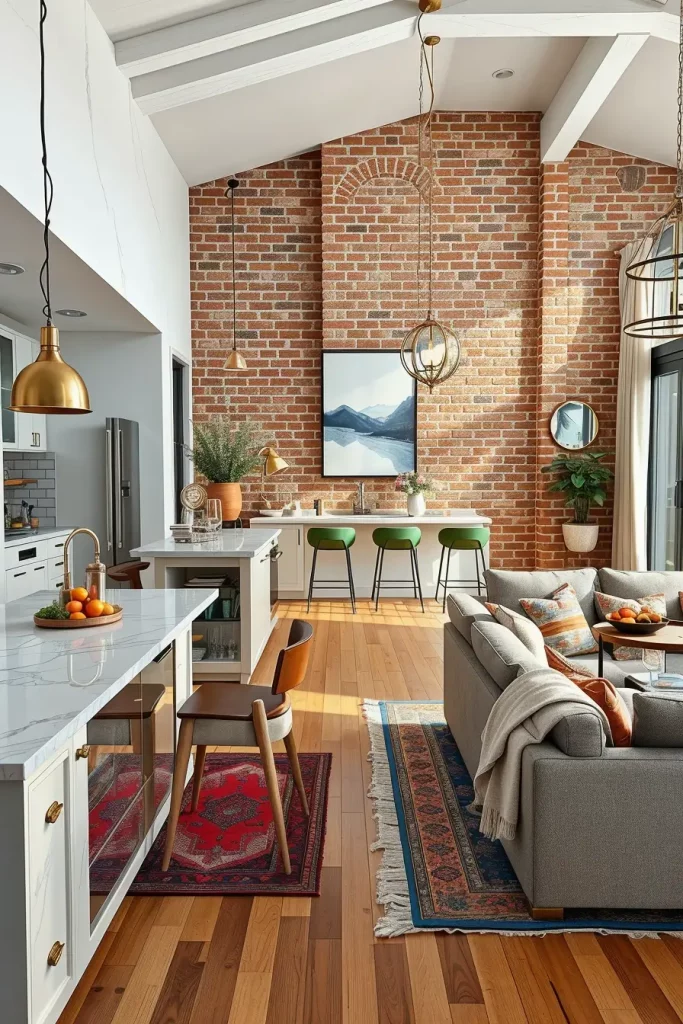I will never leave the same textures in an open kitchen living room to avoid monotony. The depth and personality are created by smooth marble countertops, rough brick accent walls and soft upholstered furniture. The absence of walls to separate spaces makes textures important in defining space.