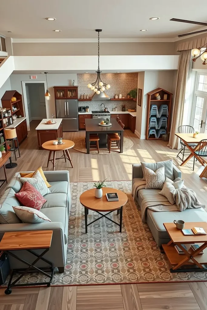 Important here is practical furniture. I usually choose extendable tables, nesting coffee tables, or modular sofas that have concealed storage. These options ensure that the area is free of clutter and gives it flexibility to change activities.
