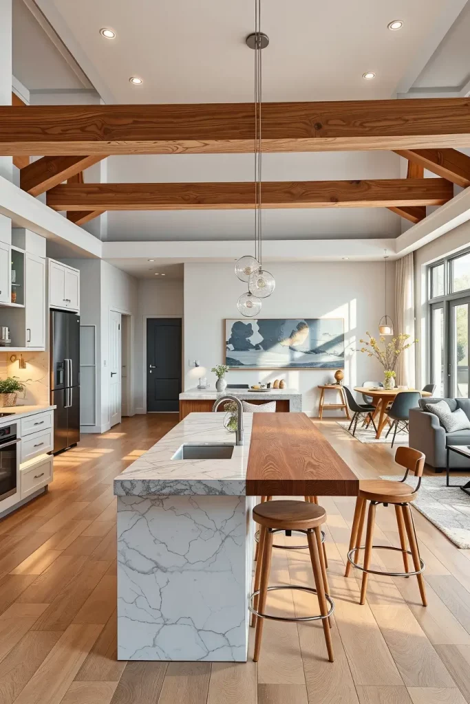 I have always loved designs that are not distinct between kitchen and living space. This is attained in 2026 by common textures, colors, and selected furniture. An example could be a marble island that will reiterate the finish of the coffee table and the cabinetry colors will be the same as the shelving in the living room.