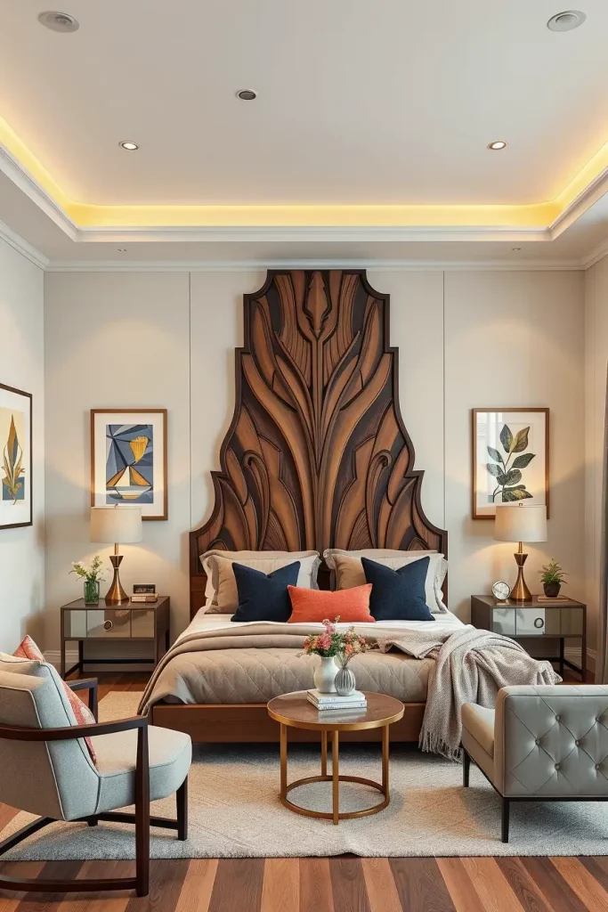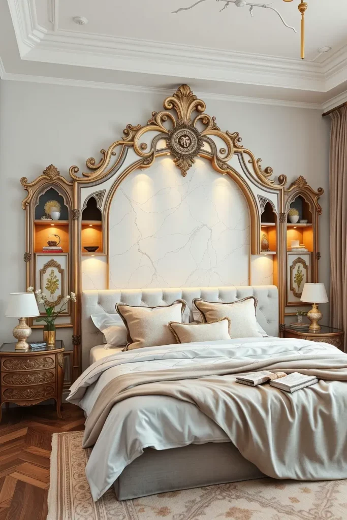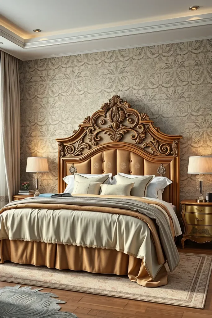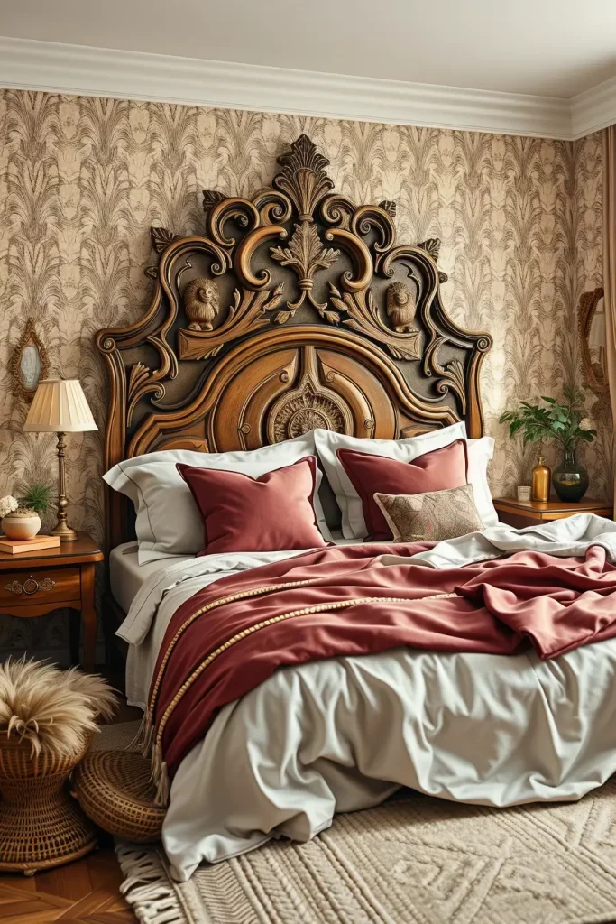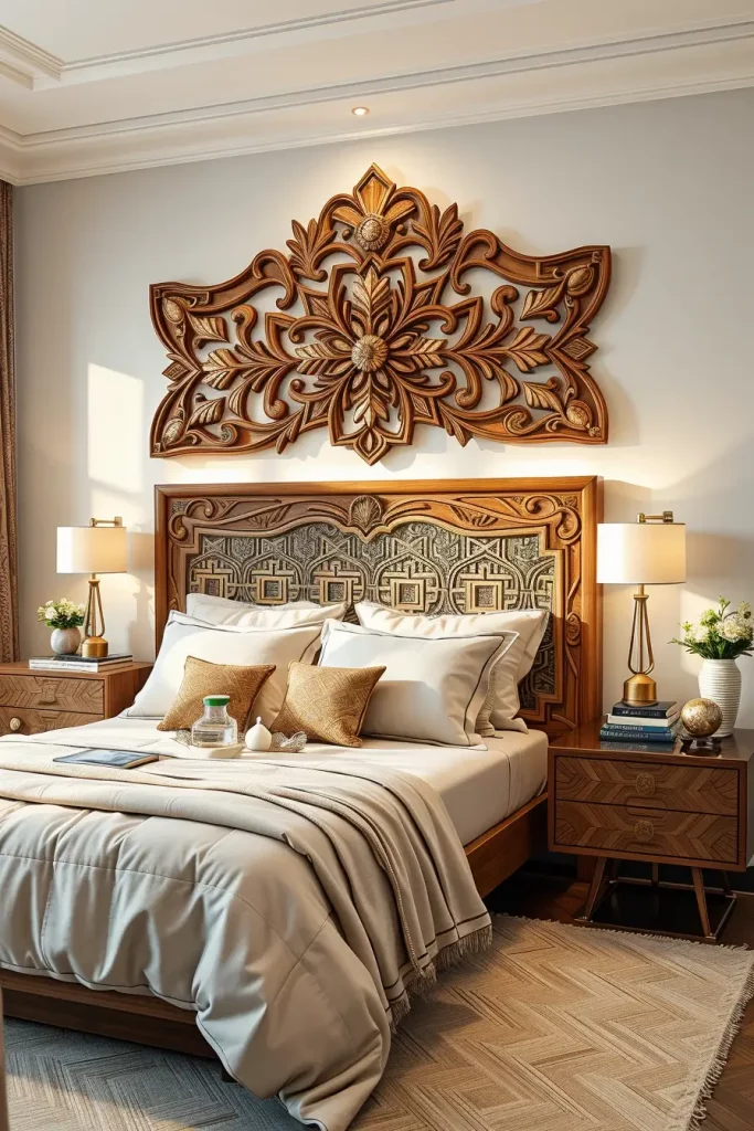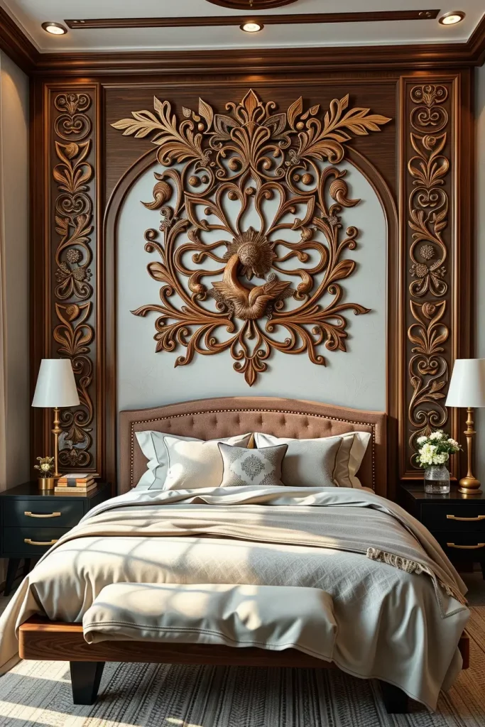Every piece of furniture in the room surrounding a highly patterned headboard has to be selected carefully. A tufted bench at the end of the bed or velvet curtain adds to the royal nature of the room. Personally, I think that metallic finishes, such as gold lamps or mirrored side tables, reinforce the carved designs to make a harmonious appearance without overloading the senses.