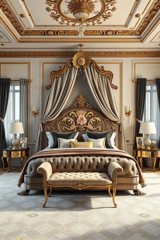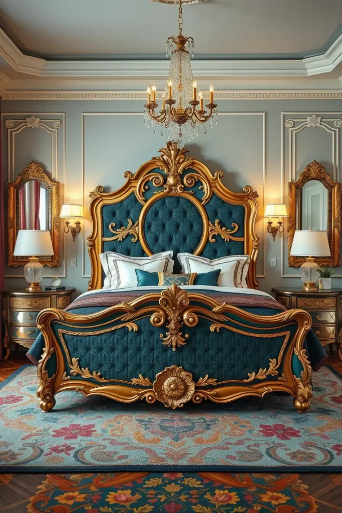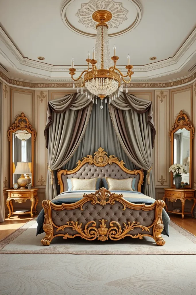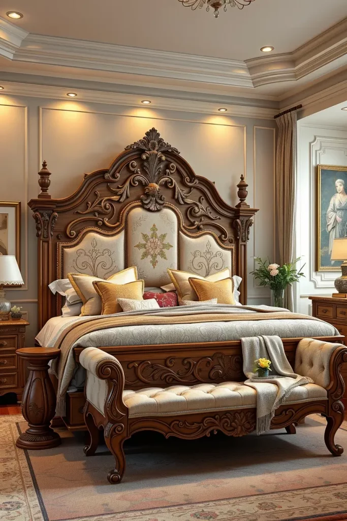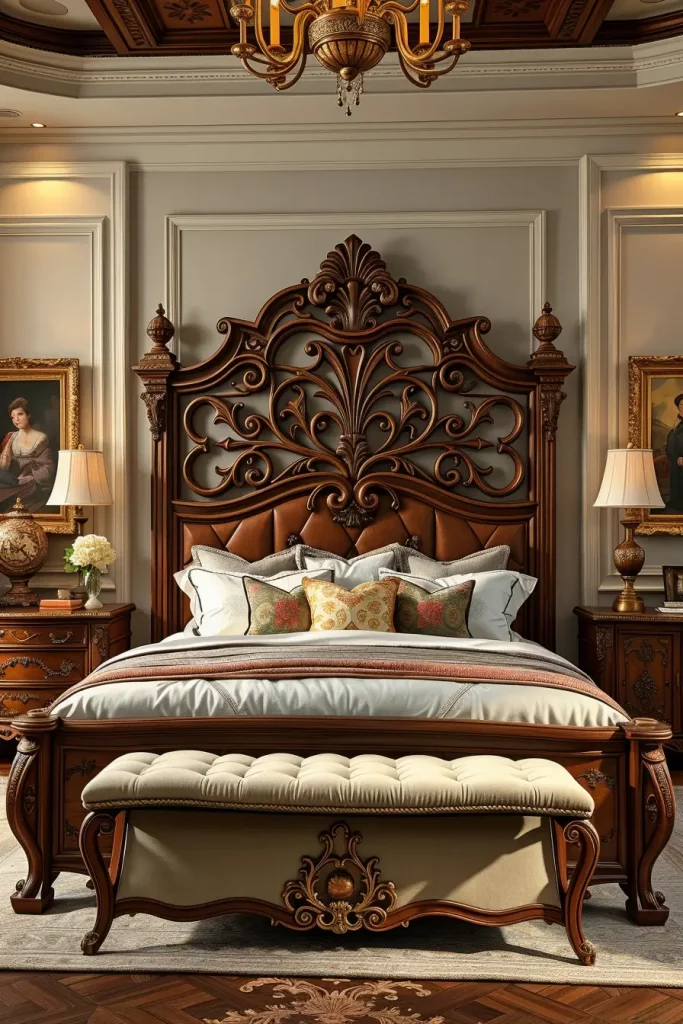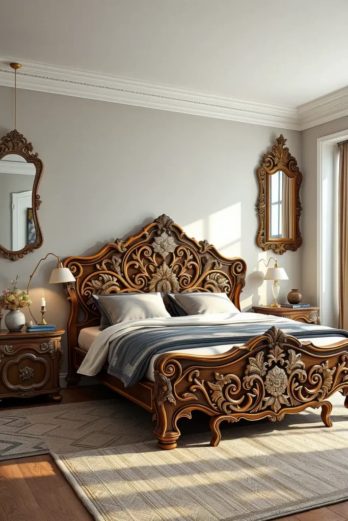 I usually contrast Baroque-inspired beds with large accessories, including tall mirrors, velvet curtains, and gold-decorated nightstands. It is aimed at establishing a balance between the excessively large bed frame and the rest of the room without overloading the senses. The last detail is usually a crystal chandelier that makes everything complete.