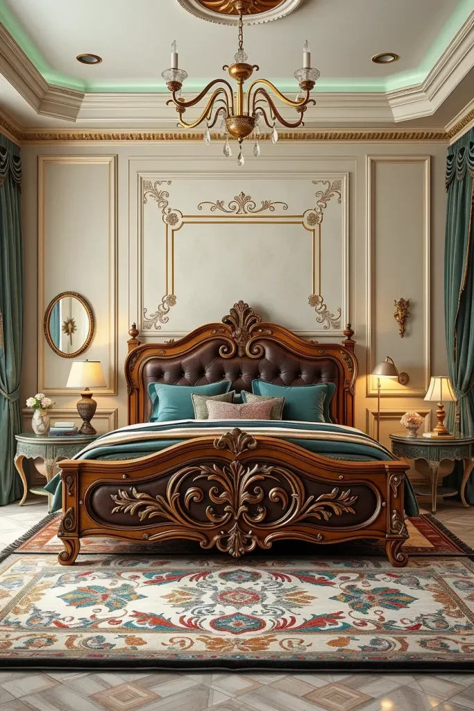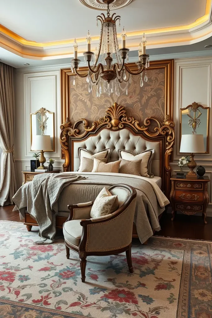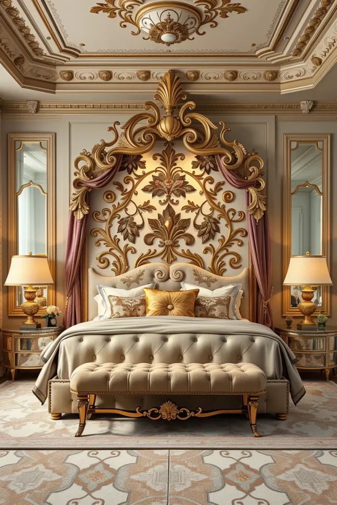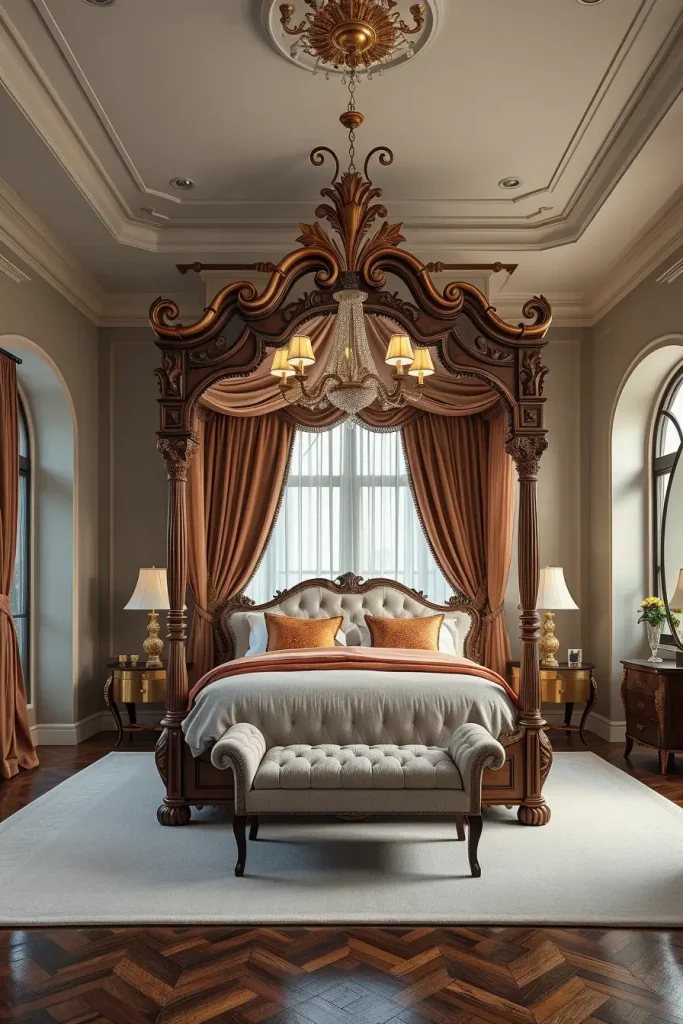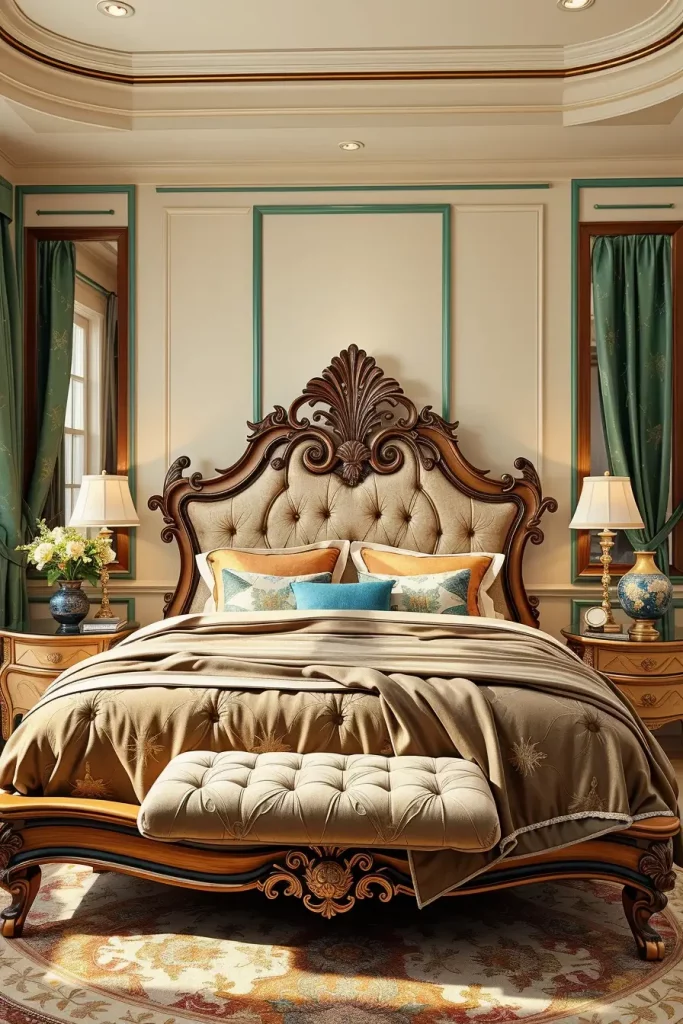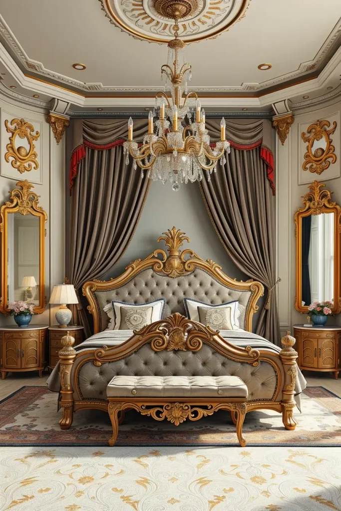 I usually contrast Baroque-inspired beds with large accessories, including tall mirrors, velvet curtains, and gold-decorated nightstands. It is aimed at establishing a balance between the excessively large bed frame and the rest of the room without overloading the senses. The last detail is usually a crystal chandelier that makes everything complete.