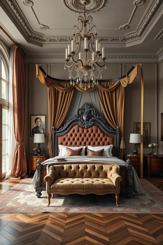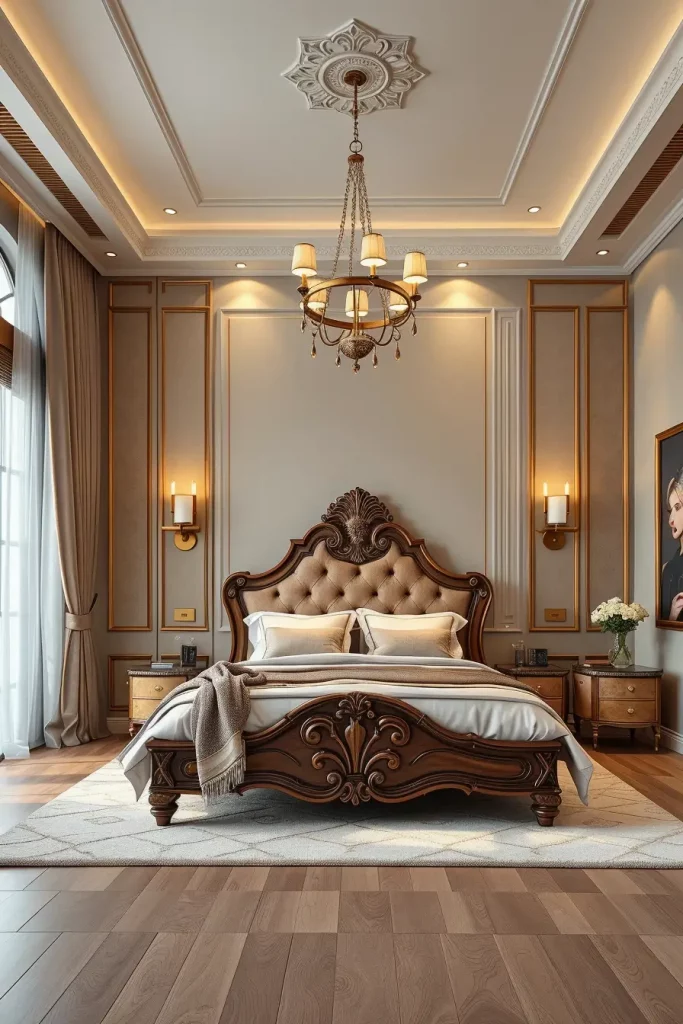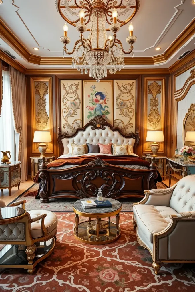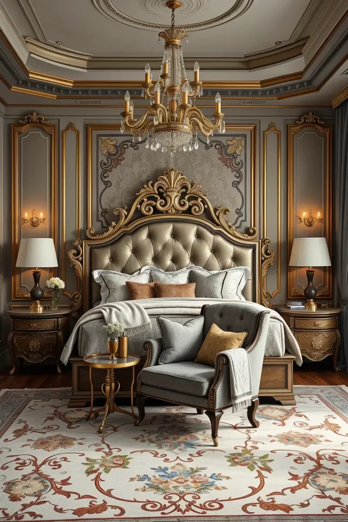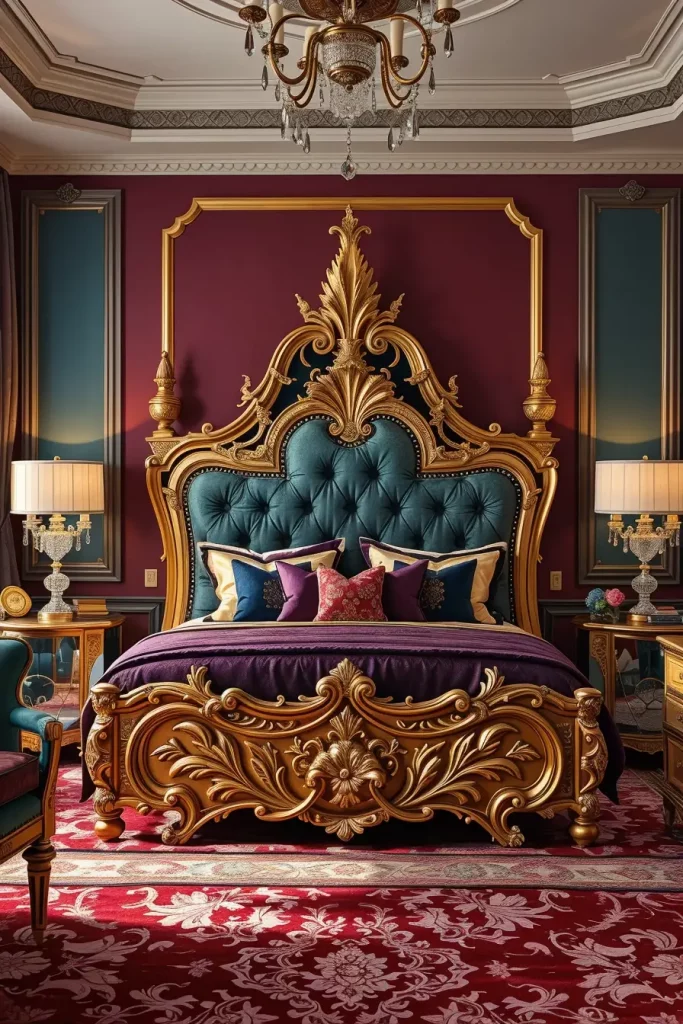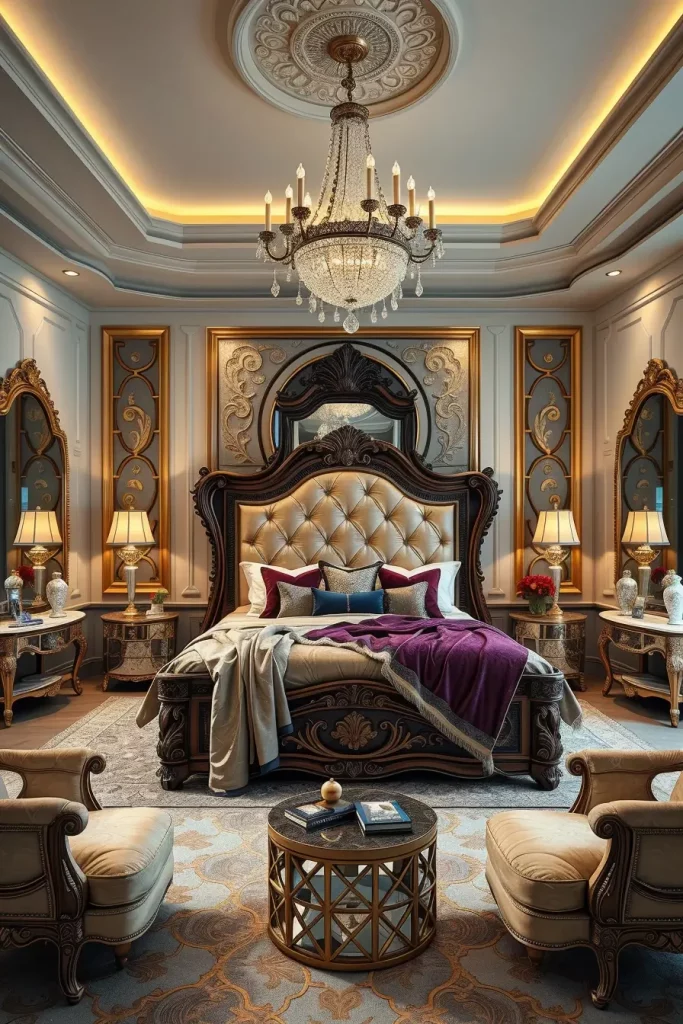 I usually contrast Baroque-inspired beds with large accessories, including tall mirrors, velvet curtains, and gold-decorated nightstands. It is aimed at establishing a balance between the excessively large bed frame and the rest of the room without overloading the senses. The last detail is usually a crystal chandelier that makes everything complete.
