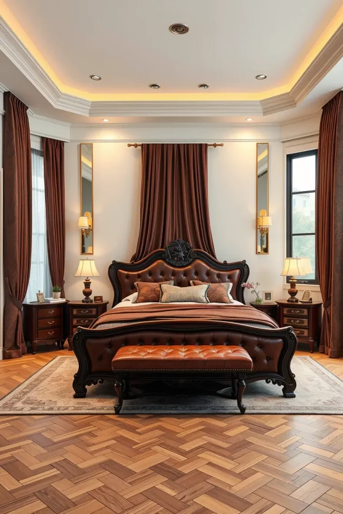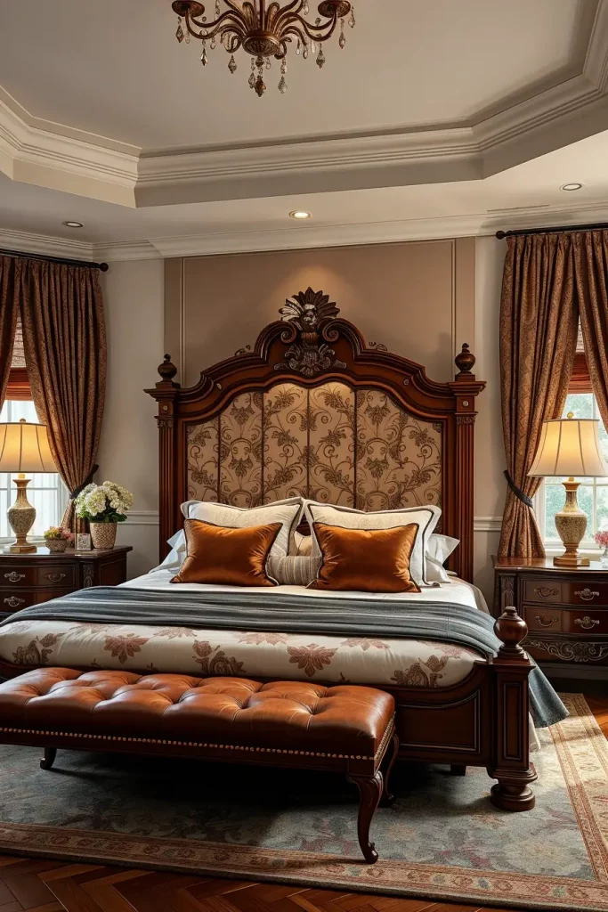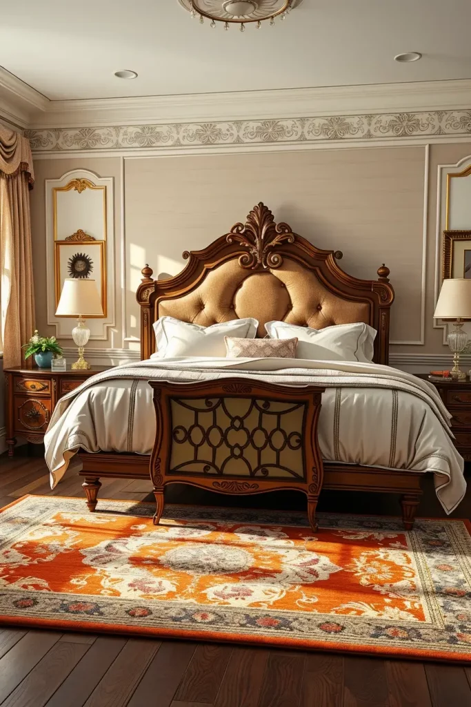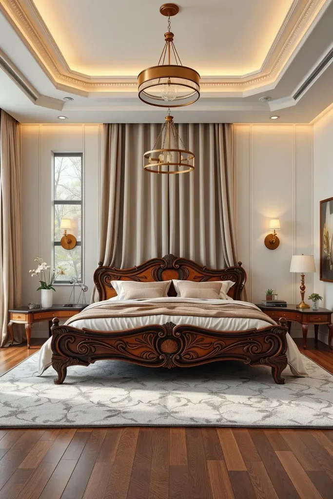 Bed itself must be the main element of the room. A carved wooden headboard with heavy fabrics such as velvet or linen will balance out the design. To add more to the style, a bedside table with metallic finishes or a neutral upholstered bench at the foot of the bed will be just perfect. The combination of curtains and rugs of the same tones makes the whole interior consistent.