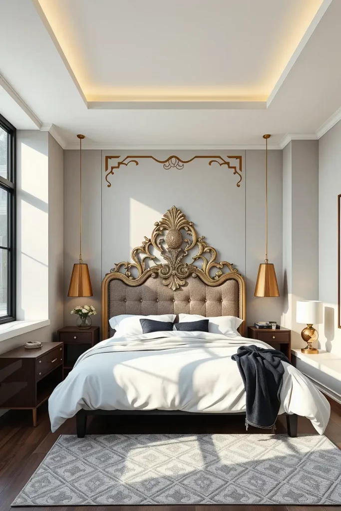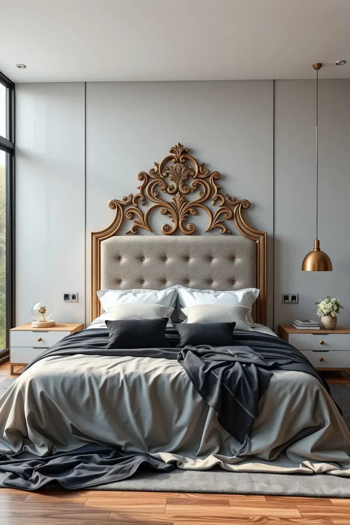 I usually combine these decorative elements with streamlined furniture items such as minimal nightstands and minimalistic lamps to keep the room free of clutter. Neutral or monochrome bedding also contributes to the contrast, so the ornate feature is prominent, but does not overpower the design.