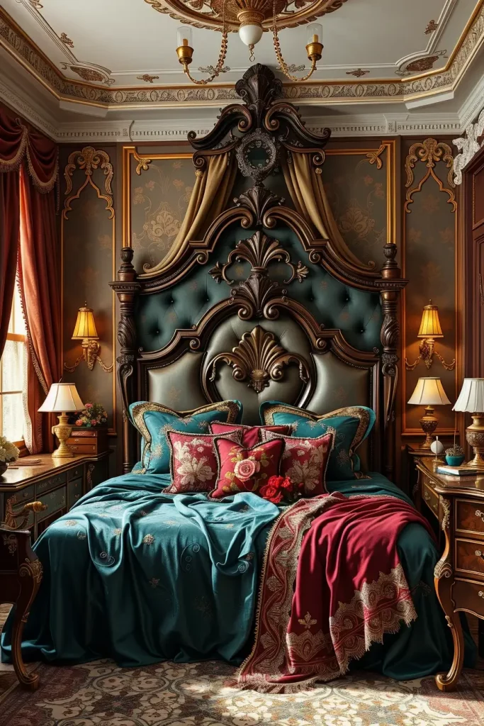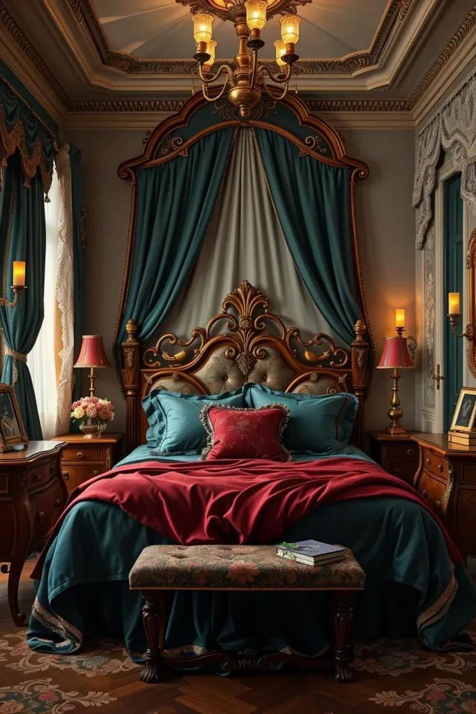 I usually combine Victorian headboards with the furniture of the same period, which is rich in details, such as rich dressers, side tables with curved legs, and brass fittings. Deep jewel-toned rich bedding, emerald or burgundy, adds to the historic feel but also adds warmth and richness to the room.